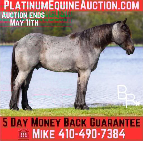 ONLINE AUCTION Place your bids at www.PlatinumEquineAuction.com Starting Bid $3500 Auction ends May 11th, 2025 Need a new saddle? Check out White Rock Saddles on our website or Facebook! This beautiful Blue Roan gelding may just be the best draft cross we have ever had through our program! Ernie is a 16hh, 5 year old with all black points and he is one sharp looking guy! He is a barn favorite here and sure to be a barn favorite in your barn. Gorgeous color with an exceptional personality and rides like an old soul. This is the type of horse for your grandma, children and anyone looking for a super honest/bombproof ride. Easy to catch. Ernie stands tied for saddling, grooming, and at the mounting block. Super pushbutton ride! If you can sit on top of him you can ride him. Absolutely no funny business and comes out to work every day you ask. Leave him sit for weeks he will be the same quiet easy going horse. Exceptional trail horse, nothing rattles him. Lead the pack or stay in the back he does not care. Easy gaits and rides on a loose rein. Started over fences and very willing. All around gelding for the entire family to enjoy. Has been in the program and Beaver Ranch and stand behind him 150%. Check out our video highlighting everything from saddling, loading, trail riding, obstacles, jumping and Walk, Jog, Lope. Sells with UTD basic PPE, Coggins, Health Papers, Vaccinations, Dentist, Farrier. We HIGHLY encourage customers to come try our horses in person before buying to ensure an excellent fit between horse and rider. We are so confident that you will love our horses that we will personally cover all travel and lodging expenses for the winning bidder if they come try before they buy/bid. While here you are welcome to try our horse any where/way that you like, on the trails, out on the ranch, in the arena or working cattle. Anyone who comes to try out horses in person will receive a 5 day money back guarantee from time the horse arrives in your possession. Also included will be the option to receive a 1 hour riding lesson with Beaver Ranch to better learn how to communicate with your new horse. NOW AVAILABLE!- Facetime/Skype video call meet and greet with Ernie. Anything from handling/saddling to riding can be accommodated subject to availability. For more information on Ernie or to schedule a time to visit Ernie please contact Beaver Ranch Mike 410-490-7384 or Lindsey 443-786-5611. ONLINE AUCTION Place your bids at www.PlatinumEquineAuction.com Starting Bid $3500 Auction ends May 11th, 2025 Need a new saddle? Check out White Rock Saddles on our website or Facebook!