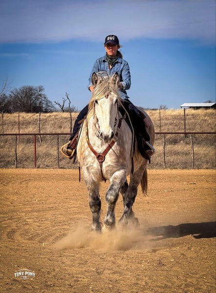 "AVAILABLE ON ONLINE HORSE AUCTION AT www DOT PlatinumEquineAuction DOT com BIDDING OPEN NOW thru SUNDAY | MARCH 1ST! *Final price will be determined on auction site* CONSIGNOR CONTACT INFO: Tiny Pony Co. 406-250-9530 LOCATION: Jacksboro, TX Tiny Pony Co. proudly offers Torgard. This gelding is a stunning and unique rose grey dapple, Old-World built Percheron. He is 6 years old and stands an impressive 16.2h. Torgard lives up to his name, which means “protected by thunder”. He has the presence of a war horse with the heart of a best friend. He has been a part of our program (and our family), since early last summer - we have grown to know him well and love him immensely. He has proven to be a calm, confident and kind horse. He thrives on deep connection, we calll him a “people horse” - he prefers to spend time in community with his humans. Torgard has more personality than a lot of folks we know. He is pure entertainment, very cheeky and playful - he will steal the gloves from your pocket, the hat off your head or the flag during training (see video!) His playfulness is nicely balanced with soft, snuggly moments - making him that much more lovable. On the ground, Torgard has learned to be respectful of his leaders personal space. He will stand tied (often napping) all day. He also ground ties nicely. He loves attention - lengthy grooming sessions and long chats take him right to his happy place. Torgard thoroughly enjoys working at liberty and is content to just hang out with his people - no lead rope required. In the saddle, Torgard feels gentle yet confident - as though he understands the importance of protecting his rider. He walks with purpose and pride. His gaits are very smooth for a gelding of his size and he is soft in the ribcage, moving around nicely for a horse of his stature. He is a comfortable ride, picks up the correct leads, side passes, half passes and stops nicely off the seat and “woah”. He isn’t heavy in the bridle and moves well off of leg pressure. He has the strength and stamina to easily carry any rider on an all day adventure. He is the same horse every day you pull him out to work - he puts his head right in the halter, ready to spend time with you - any way you’d like. Take this one anywhere and any which way you want - we believe he was born to hit the trails and that he would excel as a backcountry hunting mount, pack horse or even a mounted patrol horse. He is brave, sure footed, patiently stands rein on mane and loves being out in nature. He will also stand calmly to be mounted from the ground, a rock, a log and yes, even the scary mounting block! He is both willing and a quick study. Torgard can be kept out in a herd or in a stall with no trouble. He has proven to be middle to low end of the pecking order out on pasture. He loads and unloads from the trailer with ease. As much patience as this sweet horse has, when it comes to getting a trim from the farrier, he requires a little help and understanding. He is never rude, but struggles sometimes to find his balance - however, he has shown great progress in this area! This guy is an easy keeper that requires no maintenance and is currently on a forage only diet. He sells sound, UTD on vaccines and has freshly floated teeth. PPE welcome at buyer’s expense. Located in Jacksboro, TX. Text or call Courtney Maddux @ 406.250.9530 for more information or with questions! Tiny Pony Co. riders are 5’6 and 6’5 for reference.