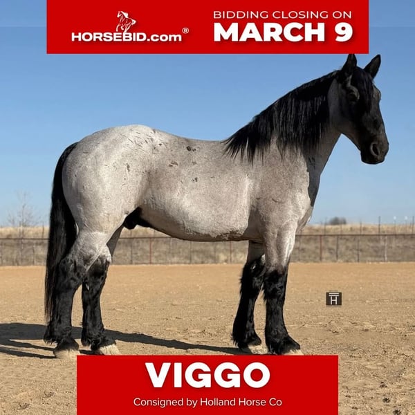 ℳ𝒶𝓇𝒸𝒽 ♦️𝐑𝐈𝐃𝐄𝐑'𝐒 𝐂𝐇𝐎𝐈𝐂𝐄♦️ Happening now thru MONDAY | MARCH 9th - Available EXCLUSIVELY on HorseBid's website! For more details and to register visit: www.Horsebid.com CONSIGNOR CONTACT: Holland Horse Company 559-978-6320 LOCATION: Weatherford, TX BREED: Draft Cross REGISTERED: No COLOR: Blue roan HEIGHT: 18 AGE: 6 GENDER: Gelding Viggo is a 2020 jaw-dropping powerhouse of a gelding standing a true 18 hands tall. Viggo is built strong and solid with excellent bone, yet he moves like a Cadillac and has an impressive amount of athleticism. He has three of the smoothest gaits you will ever sit — his jog is effortless and comfortable enough to ride all day, and his lope truly feels like he is floating. Viggo is well broke both English and Western. • English: Rides soft and easy in a simple snaffle, lightly started over fences and takes to it naturally. • Western: Rides one-handed in a bridle, loose-reined, and happily travels at whatever pace is asked of him. Outside the arena, Viggo shines just as bright. He is exceptional on the ranch and the trails — calm, steady, and genuinely enjoys exploring. He will cross water, logs, bridges, and rough terrain without hesitation and will go all day if you ask him. Viggo is a truly special horse who enjoys bonding closely with his person. He can be slightly nervous when first approached on the ground, but once he warms up he absolutely loves attention (and treats!). He is extremely intuitive, alert, and always tuned in to his rider. He has impeccable ground manners and is very respectful. In turnout he is playful and gets along well with others, yet he is quiet and mannerly in a stall. He is sound, straight, and clean-legged with rock-hard feet and has always been kept barefoot. FMI: Call or text Chanel – Holland Horse Company 559-978-6320 We are happy to tell you more about this guy and answer any questions you may have.