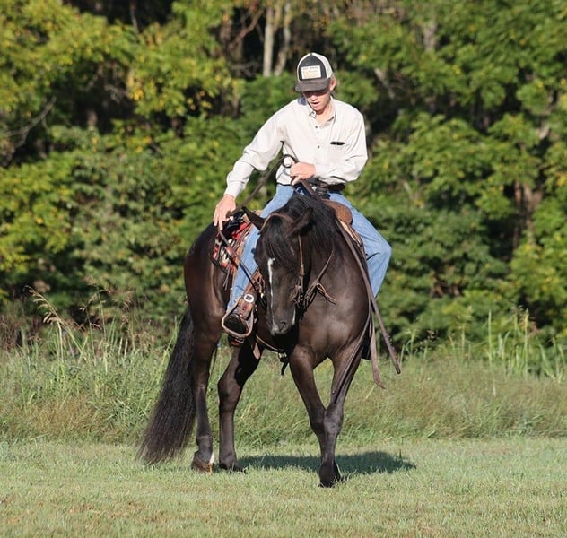 ONLINE AUCTION Place your bids at www.PlatinumEquineAuction.com Starting Bid $3500 Auction ends October 6th, 2024 Need a new saddle? Check out White Rock Saddles on our website or Facebook! Batman is a jet black quarter horse cross gelding standing around 14.3hh and he is 6 years old. He is one classy looking guy! Not only does he look classy, he is has all of the other boxes checked as well… he is Mr. Personality, as friendly as they come, loves attention and is very calm natured. Batman has that calm nature that makes him a great family horse and he is a horse that anyone will get along with. Batman has been ridden by every member of our family and he is safe! He has been ridden down the highways and he is traffic safe as well. Batman is great on trails and he will cross creeks, ditches, logs and navigate rough rocky areas. He has a smooth jog, a VERY VERY nice easy to set lope, a good stop, turns a circle both ways and backs with ease! He has been exposed to all kinds of wildlife such as deer or turkey or other animals like cows or dogs and will go anywhere that he is asked too. He has been rode many miles in the mountains of Eastern Kentucky and encountered every obstacle possible on the trail. He will go up or down even the steepest slopes, across deep creeks, over downed trees, and over all types of rough terrain while still being sure footed. Batman is not cinchy, cold backed, does not crib or weave. Batman is a super cool horse that anyone is sure to love!!! Feel free to call Moore Trained Horses Logan 765-265-0033 with any questions. ONLINE AUCTION Place your bids at www.PlatinumEquineAuction.com Starting Bid $3500 Auction ends October 6th, 2024 Need a new saddle? Check out White Rock Saddles on our website or Facebook! ONLINE AUCTION Place your bids at www.PlatinumEquineAuction.com Starting Bid $3500 Auction ends October 6th, 2024 Need a new saddle? Check out White Rock Saddles on our website or Facebook!