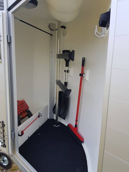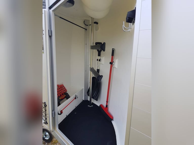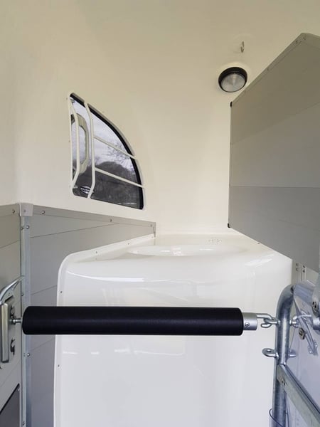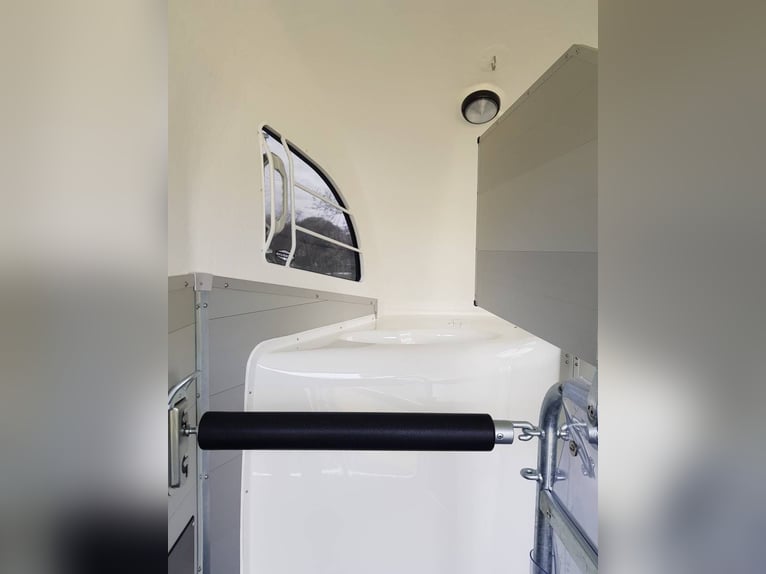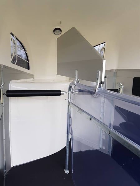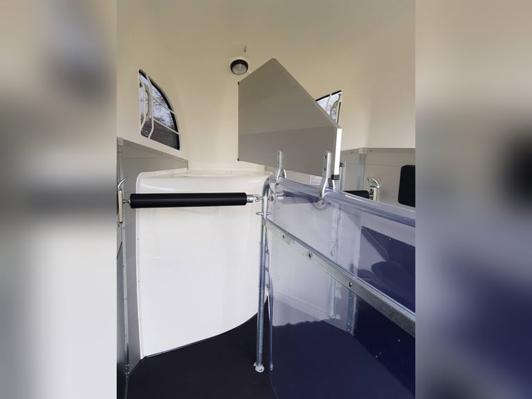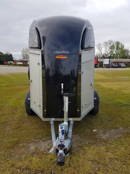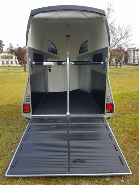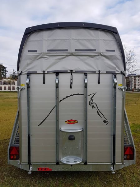 Van Bockmann CHAMPION R LUXE ALU ** IN STOCK** * Gross Vehicle Weight Rating (GVWR) 2,400 kg (possibility of detachment for GVWR 2,000 kg or less) * Aluminum body * Anthracite polyester roof with 2 tinted, operable windows * Low-profile chassis CFF+ with wheel suspension * Automatic jockey wheel * Aluminum floor * Side padding (cushion) * Composite bumper * Interior lighting * Anti-panic breastbar (Multy Sage System) * Maneuvering handle * Decorative strips with horse head motif * Tack room with telescopic saddle rack, mirror, door net, broom, and shovel * Spare wheel cover * Head divider available as an option You can order directly through our website or contact us for a purchase with free delivery across Europe.