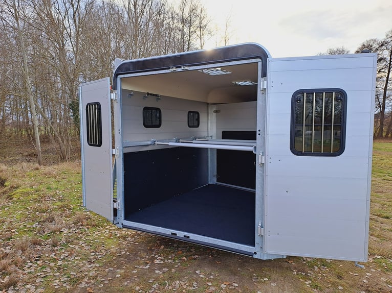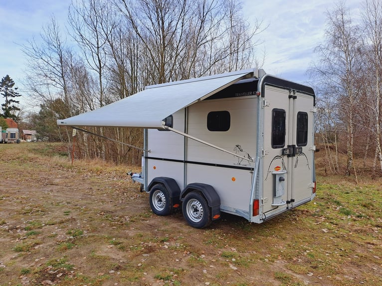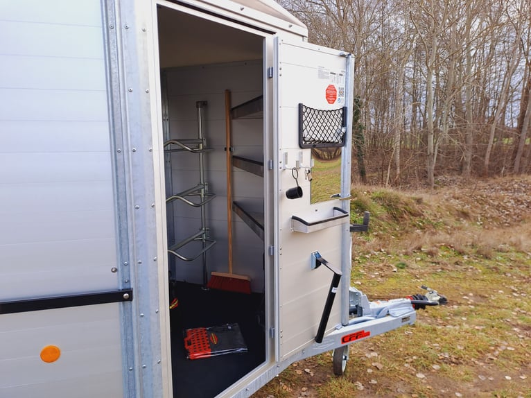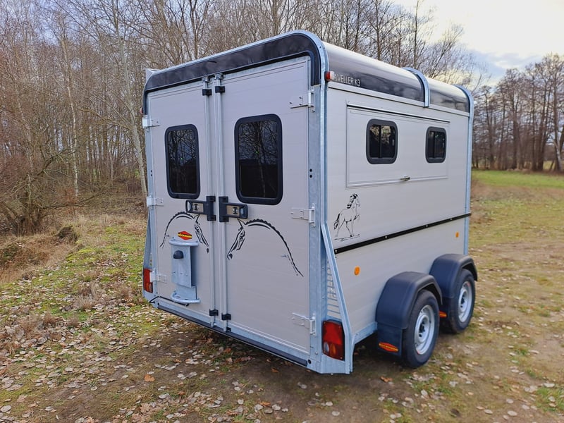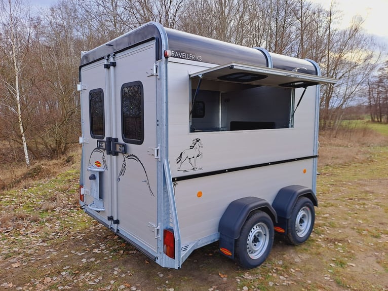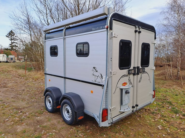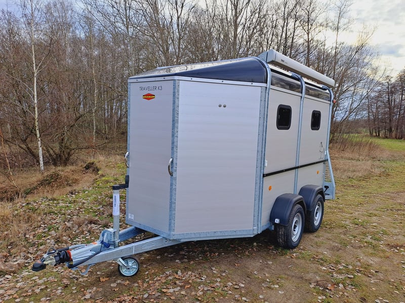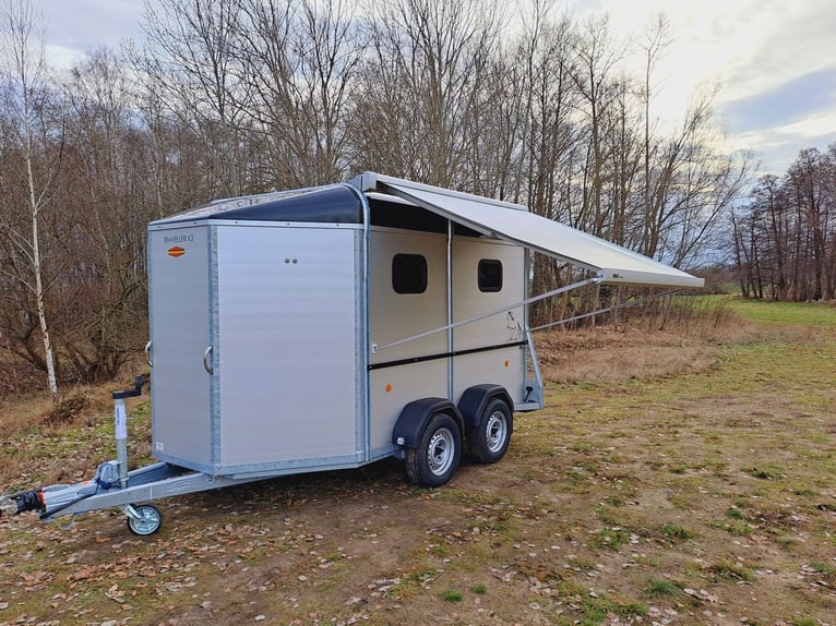 We are selling a new horse trailer Traveller K3 Big SK at a special price... -Ab. Total weight 2700 kg - Payload 1480 kg - Hood in anthracite metallic - Chassis lowered with wheel shock absorber - Automatic jockey wheel - 2 small sliding windows on the left - 2 roof vents in hood - Kick protection on the left and on the partition wall, e.g. tack room - 1 piece of tethering rod on the outside left - 3 telescopic dividers adjustable with bracket on side wall - Extra large tack room with swivel wall and padding - Door in tack room to the horse compartment - Entry-level stool - Aluminum floor - Double-wing door instead of rear flap with small Sliding windows - Pop-up flap with sliding windows on the right - 3 shelves on the front wall inside with compartment - Awning 2650 x 2000mm left - plus 30€ vehicle papers more new and used horse trailers in stock! Vehicle registration for registration is possible for a surcharge of 5 € in advance! Viewing/pick-up in 16845 Großderschau by arrangement at 033875-909588 possible at any time! Delivery by arrangement, trade-in and financing possible Opening hours: Monday - Friday 8.00 a.m. - 5.00 p.m.
