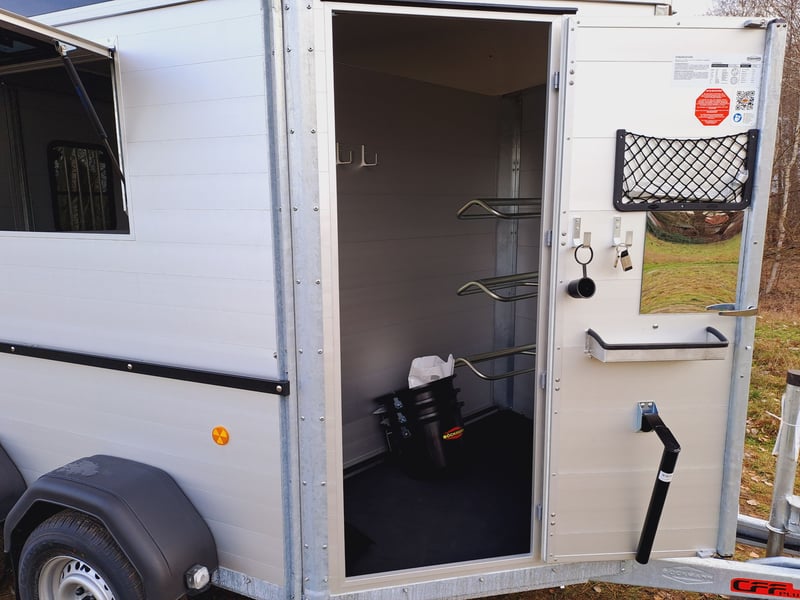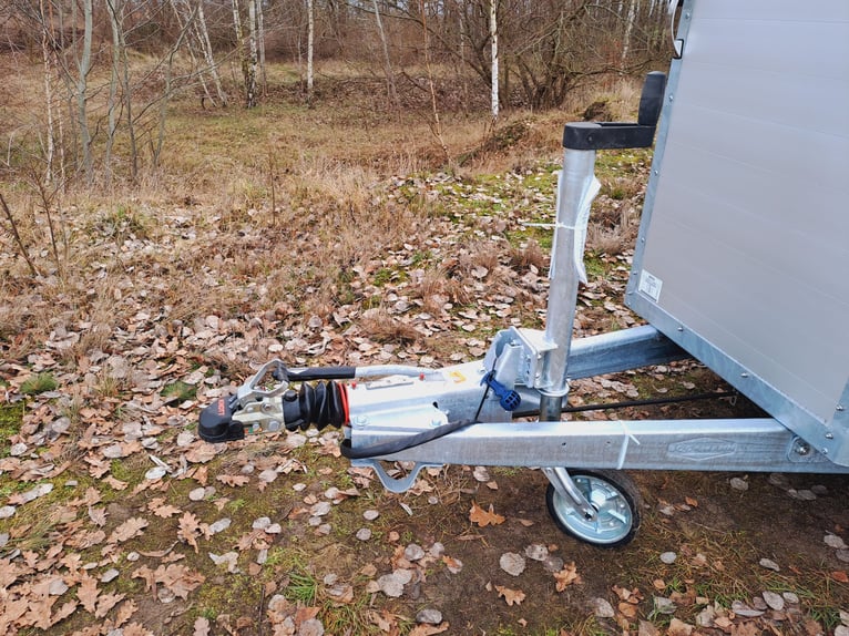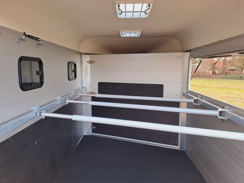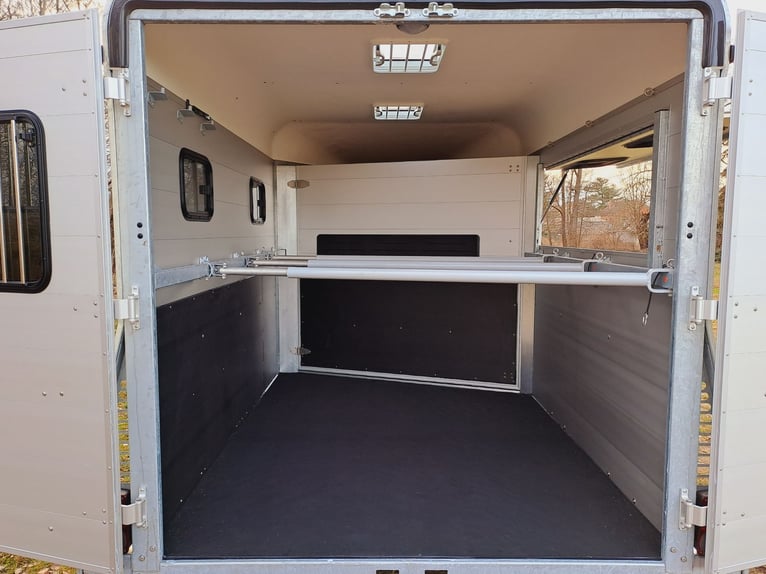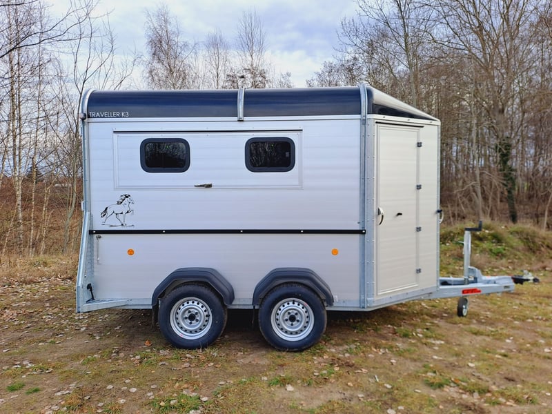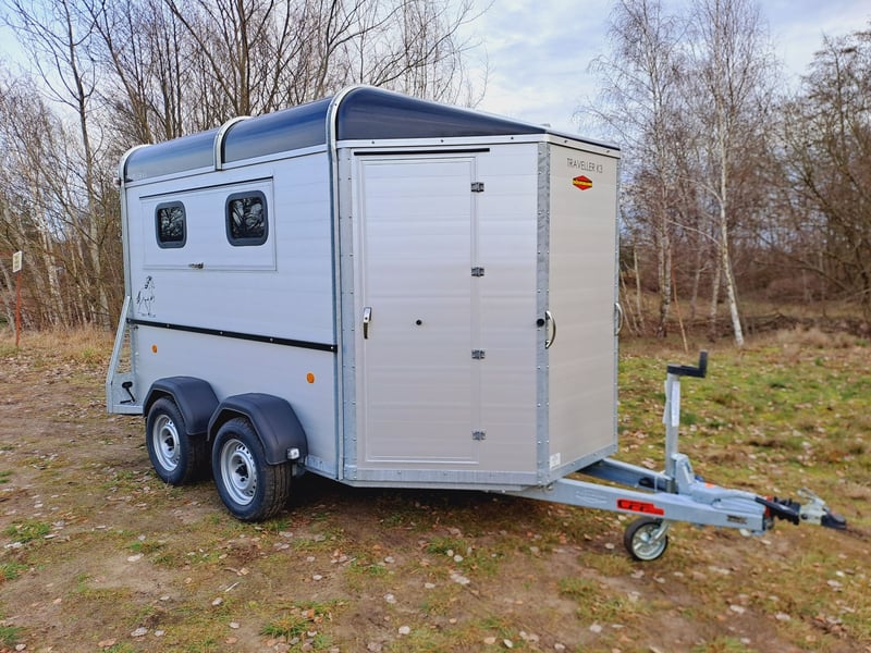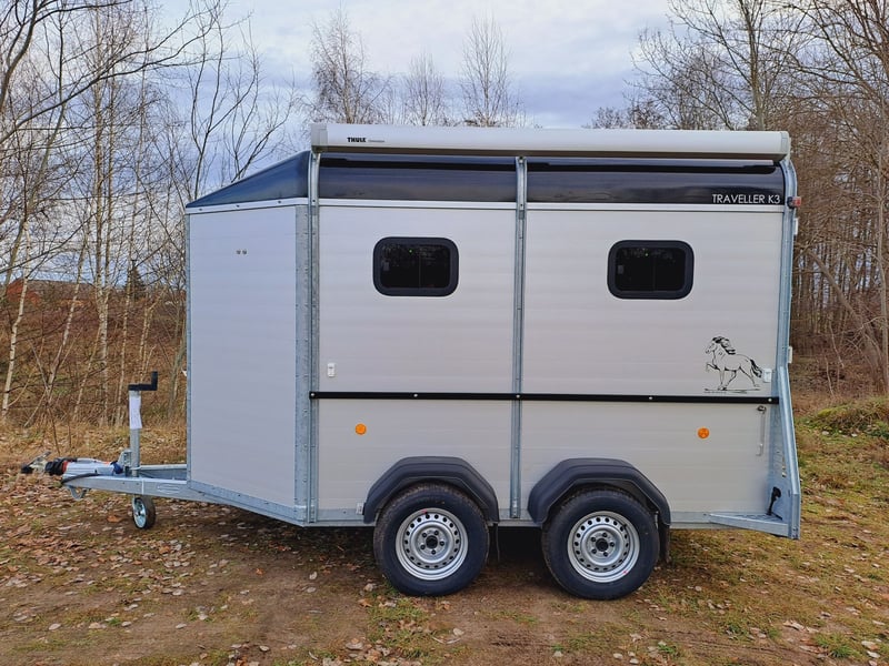 We are selling a new horse trailer Traveller K3 Big SK at a special price... -Ab. Total weight 2700 kg - Payload 1480 kg - Hood in anthracite metallic - Chassis lowered with wheel shock absorber - Automatic jockey wheel - 2 small sliding windows on the left - 2 roof vents in hood - Kick protection on the left and on the partition wall, e.g. tack room - 1 piece of tethering rod on the outside left - 3 telescopic dividers adjustable with bracket on side wall - Extra large tack room with swivel wall and padding - Door in tack room to the horse compartment - Entry-level stool - Aluminum floor - Double-wing door instead of rear flap with small Sliding windows - Pop-up flap with sliding windows on the right - 3 shelves on the front wall inside with compartment - Awning 2650 x 2000mm left - plus 30€ vehicle papers more new and used horse trailers in stock! Vehicle registration for registration is possible for a surcharge of 5 € in advance! Viewing/pick-up in 16845 Großderschau by arrangement at 033875-909588 possible at any time! Delivery by arrangement, trade-in and financing possible Opening hours: Monday - Friday 8.00 a.m. - 5.00 p.m.