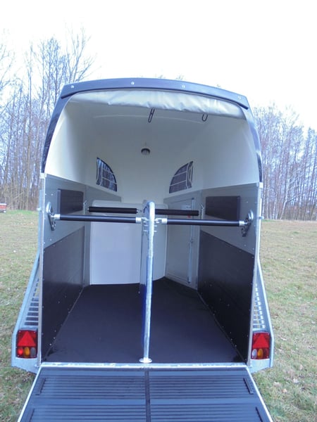 Sprzedajemy nową przyczepę do przewozu koni Böckmann ALU Champion R dla 2 koni / maska i przód w kolorze antracyt-metallic z... - dopuszczalna masa całkowita: 2400 kg - Ładowność: 1497 kg - Masa własna: 903 kg - Podwozie CFF-Plus z amortyzatorami kół - Dodatkowy wywietrznik dachowy w poliestrowym kapturze - Automatyczne koło kopiujące - Zamykany zaczep kulowy - Podnośnik plandeki z wbudowaną siatką - Skrzynka na siodło z wysuwanym uchwytem na siodło i miotłą/szufelką/siatką/lusterkiem - Oryginalna w pełni aluminiowa podłoga Böckmann - System Multi Safe (system pałąków zabezpieczających) - Oświetlenie wnętrza niebieskie / białe - Guma na klapie załadunkowej (zintegrowane paski stopni) i ogranicznik boczny - Wyściółka boczna - Zabezpieczenie stopni bocznych - Wyściełanie klatki piersiowej - System oświetlenia ze światłem cofania i 13-stykową wtyczką - Cena z VAT więcej nowych i używanych przyczep dla koni w magazynie! Dokumenty rejestracyjne pojazdu można przesłać do rejestracji za dopłatą 5 € z góry! Dostawa po uzgodnieniu, możliwa zamiana i finansowanie Oględziny/odbiór w 16845 Großderschau możliwe w każdej chwili po uzgodnieniu pod numerem 033875-909588! Godziny otwarcia: Poniedziałek - piątek 8.00 - 17.00