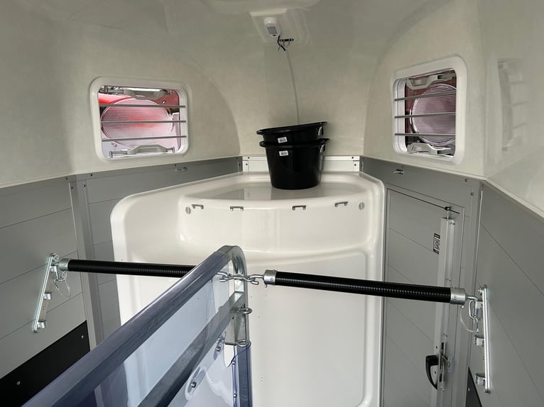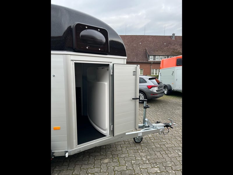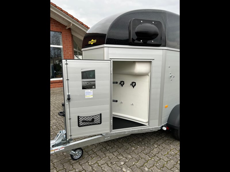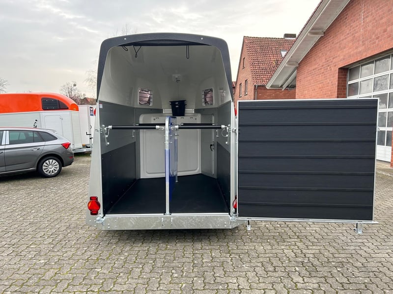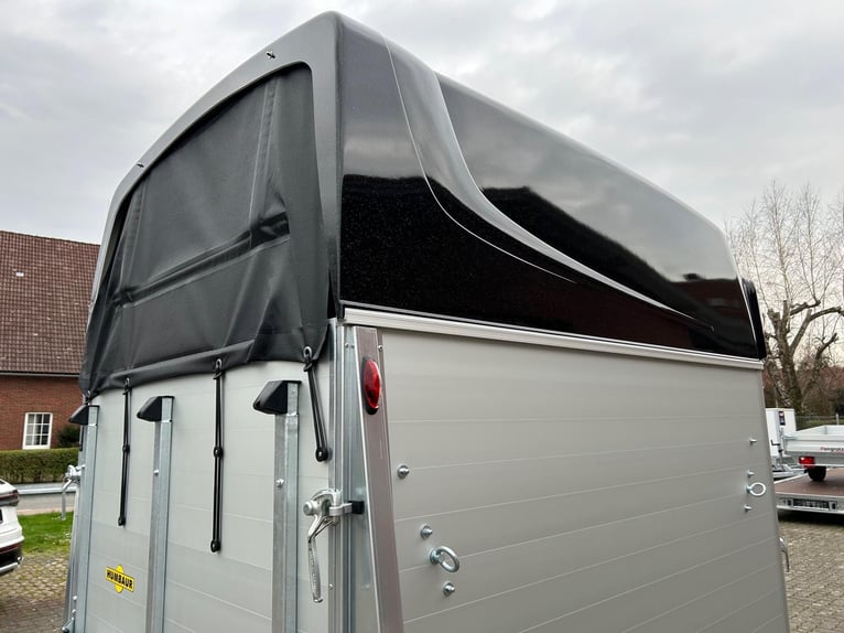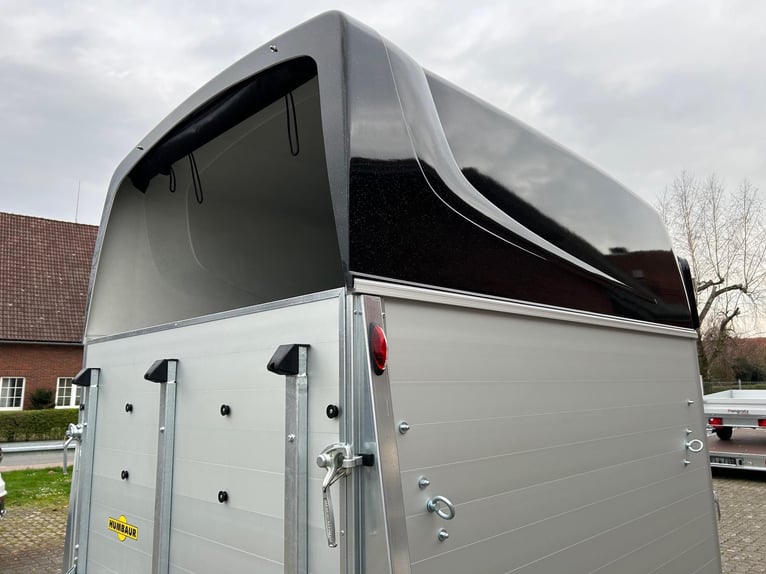 Humbaur Equitos Alu Plus Black 2000 Pferdeanhänger PKW Anhänger Alter: Neu (Produktionsjahr: 2025) 2 Jahre Hauptuntersuchung ab dem Tag der Erstzulassung Inkl. Zulassungspapiere (Kfz-Brief / Zulassungsbescheinigung Teil 2 und COC) Verfügbar ab: Sofort (auf Lager)! Finanzierung über unsere Partnerbanken möglich! Technische Daten Zulässiges Gesamtgewicht: 2.000kg Leergewicht: ca. 773kg Nutzlast: ca. 1.227kg Achsenanzahl: 2 Laderaumlänge: 3.157mm Laderaumbreite: 1.654mm Laderaumhöhe: 2.300mm Bremsenart: Gebremst, Auflaufbremse Fahrgestell: Tieflader (Räder neben Aufbau), Gummifederachsen Elektrik: 12V, 13 poliger Stecker Reifengröße: 175/70 R13 Sonderausstattung Hecktür dreh- und schwenkbar Serienausstattung EquiDrive® Fahrwerk inkl. Radstoßdämpfer (100 km/h-Zulassung) Alu-BiComp-Boden 21mm (kein Holz - unverrottbar) Gummiboden 8mm stark Seitentrittschutz Aufbau aus doppelwandigen, eloxierten Aluminiumprofilen Abschließbare Sattelkammer mit Sattelhalter, Trensenhalter, Spiegel und Netz Heckabstützung mit Beleuchtung Einstiegstür mit 3-Punkt-Verriegelung Auflaufklappe mit Trittleistengummi Geteilte und höhenverstellbare Brust- und Heckstangen mit Panikentriegelung EquiLock® verriegelbare Trennwand Getönte Ausstellfenster in Polyhaube Polyhaube in Black Metallic Innenbeleuchtung Heunetzring Windschott Automatisches Stützrad Rahmen verzinkt V-Deichsel AL-KO oder Knott Achsen und Bremsanlage Zubehör (aufpreispflichtig) Alufelgen Silver / Black Sattelablagestange für 2 Sättel (außen) Schwenkbare Sattelablage für 1 Sattel (außen) Dachfenster Fohlengitter Hecktür dreh- und schwenkbar Durchgehende Boxenstange zum Fohlentransport Trittschutzgummi für Sattelkammer Seitenpolsterung links und rechts Kopftrennwand für Mitteltrennwand Planenrollo PVC anstatt Windschott Verschleißmatte vorne Verschleißmatte hinten Anhängerschloss Reserverad 175/70 R13 inkl. Reserveradhalter Fahrzeuganlieferung deutschlandweit Zulassung deutschlandweit Überführungskennzeichen (5 Tage gültig) Hinweis Gewichtsangaben können je nach Ausstattung abweichen; Irrtümer, Zwischenverkauf und Änderungen vorbehalten!
