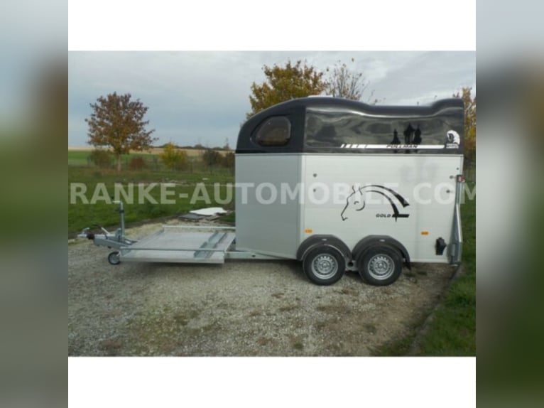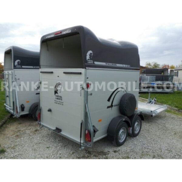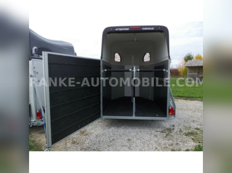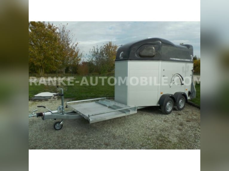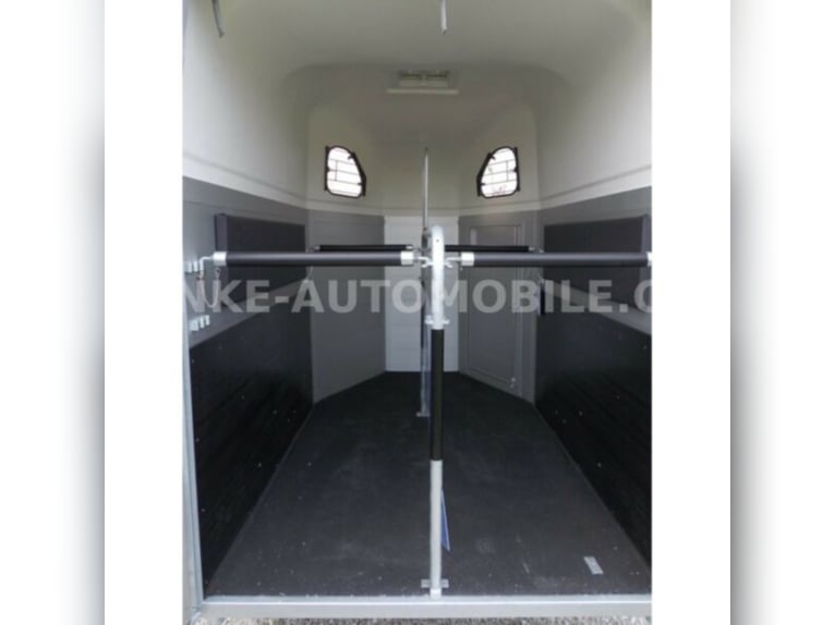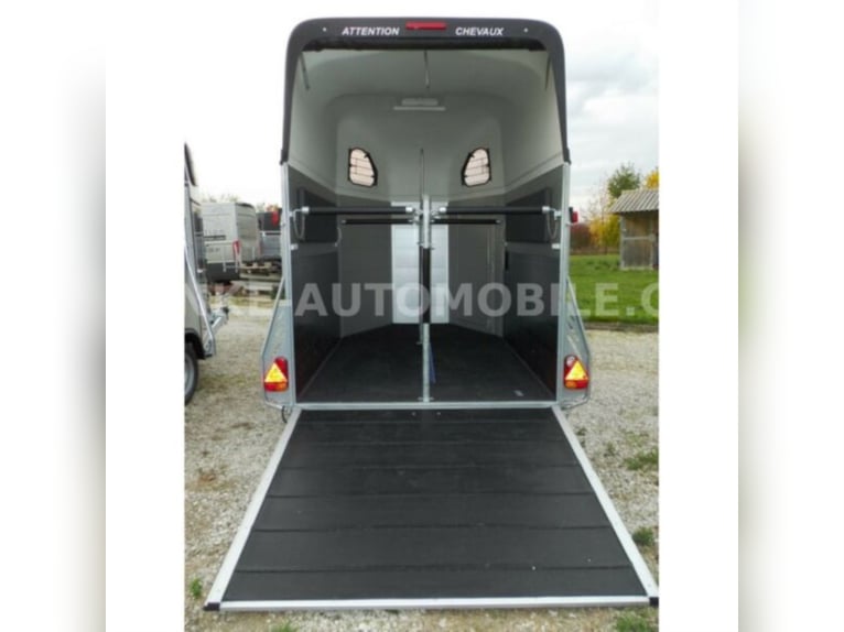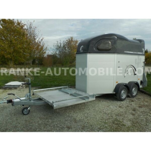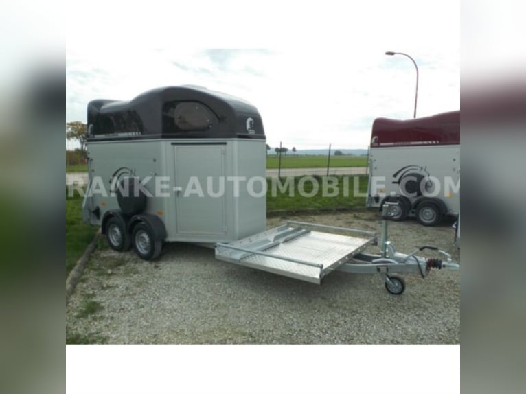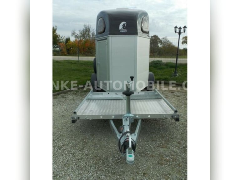 Category Animal/horse transportation, new vehicle Year of construction 2021 Permissible total weight 2,600 kg Axles 2 Payload 1,685 kg Width 2,150 mm Height 2,750 mm Load compartment length 3,150 mm Load compartment width 1,670 mm Load compartment height 2,300 mm Vehicle description For sale we offer a Cheval Liberte Hippomobile aluminum 2-horse trailer with carriage platform in front. We would be happy to advise you on our current stock of horse trailers. Standard equipment: hot-dip galvanized steel frame, rust-proof screws Side walls made of anodized aluminium Sturdy carriage platform made of aluminum checker plate with 2 drive-on ramps deep Pullmann II comfort chassis with wheel shock absorbers for 100 km/h approval Reinforced poly hood Color for poly hood: white, light grey, dark grey, black Ramp-door combination, convenient for loading with forklift, front loader, etc. ALU floor glued with 8 mm rubber flooring Tailgate with rubber floor and step strips Lockable passenger door, lock protected on the inside Barred tinted hinged windows Length and height-adjustable padded box bars roof ventilator step protection plates side cushions 2 tie-downs Spare wheel with holder and cover Panic release 4 marker lights Maneuvering handle Hay net Center partition Overrun brake with automatic reverse function Decor stickers on both sides outside 3rd brake light Rear fog light and reversing light Automatic jockey wheel Options: spacious lockable tack room with pull-out saddle holders, 2 bridle holders, mirror, storage net + 690,-. Plastic decor wheel covers on black steel rims + €120 Box lock +35,-€ Drawbar cover + 20,-€ Financing and trade-in possible. Errors, input errors and prior sale reserved.