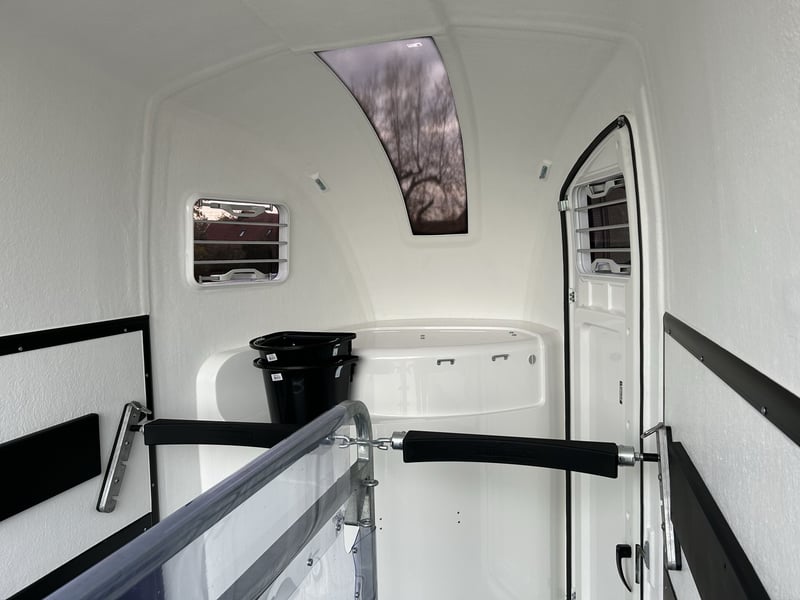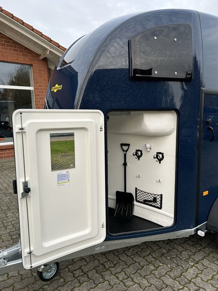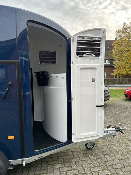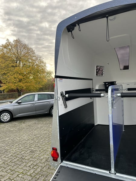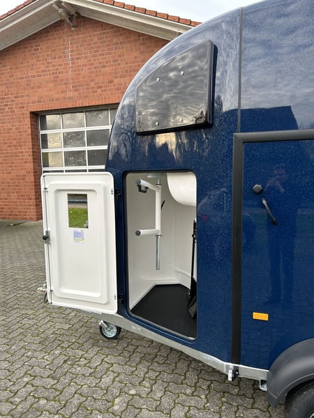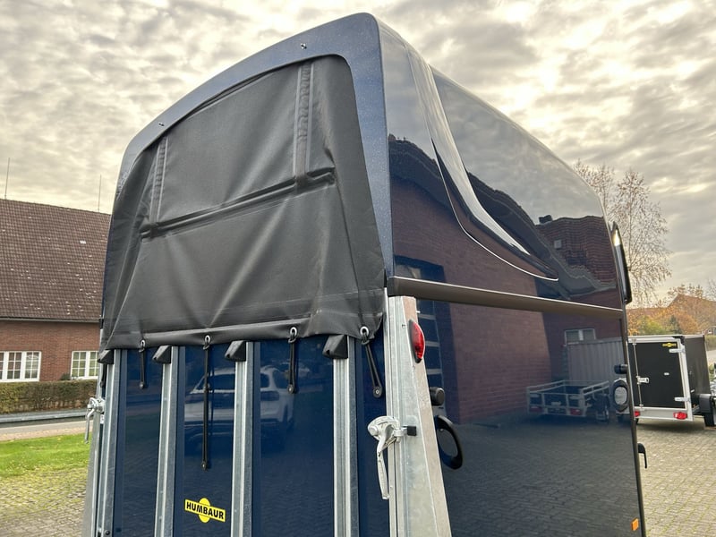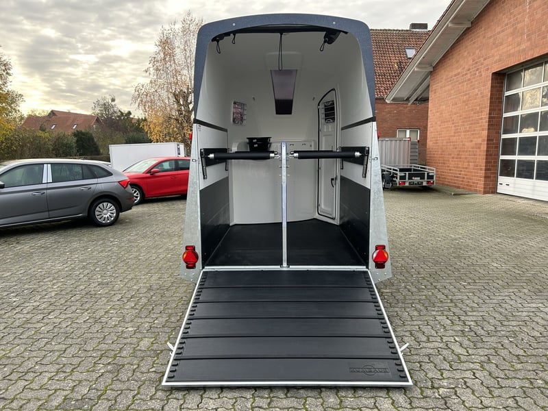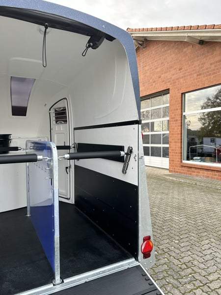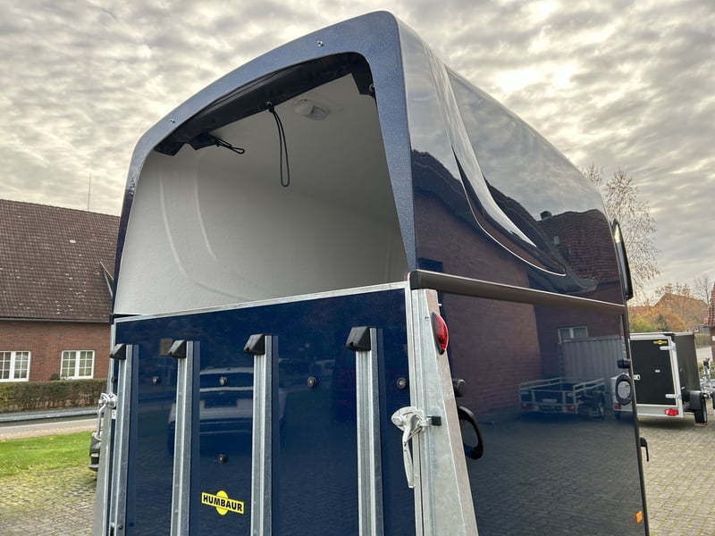 Humbaur Style 2700 S Carriage horse trailer Car trailer Condition: New (Year of manufacture: 2023) 2 years main inspection from the date of first registration Includes registration documents (vehicle registration certificate part 2 / registration certificate and COC) Available immediately (in stock)! Financing available through our partner banks! Technical data Maximum permissible total weight: 2,700 kg Unladen weight: approx. 940 kg Payload: approx. 1,760 kg Number of axles: 2 Loading length: 3,460 mm Loading width: 1,710 mm Loading height: 2,370 mm Braking system: Braked, overrun brake Chassis: Low-loader (wheels beside the body), rubber suspension axles Electrical system: 12V, 13-pin connector Tire size: 195/65 R15 Special equipment Silver / Black alloy wheels Panoramic window Side padding on both sides Standard equipment EquiDrive® Plus S chassis incl. shock absorbers and coil spring suspension (approved for 100 km/h) Alu-BiComp floor 21mm (no wood – rot-proof) 8mm thick rubber flooring Side step protection Body made of GFK with anodized aluminum profiles Aerodynamic poly-aluminum body Lockable tack room with pull-out saddle rack, bridle hooks, mirror, net, interior lighting, shovel, and broom Rear support with lighting Entry door with 3-point lock Overrun tailgate with rubber tread strip Split and height-adjustable front and rear bars with EquiGuard® panic release EquiLock® lockable partition wall Tinted side windows in poly cover Poly cover and nose in Dark Blue Metallic Interior lighting Horse net ring Windbreak Automatic support wheel Zinc-plated frame V-shaped drawbar AL-KO or Knott axles and brake system Optional accessories (additional charge) Silver / Black alloy wheels Saddle rack for 2 saddles (external) Swiveling saddle rack for 1 saddle (external) Roof window Foal grille Rotatable and pivotable rear door Continuous box bar for foal transport Rubber step mat for tack room Side padding on both sides Head partition for middle divider Partition wall with wooden panel PVC roll-up tarpaulin instead of windbreak Poly cover in color Wear-resistant mat at the front Wear-resistant mat at the rear Sealing of tailgate according to EC No. 1/2005 Contour marking of horse trailer all around the tailgate Panoramic window Trailer lock Spare wheel 195/65 R15 including spare wheel holder Vehicle delivery throughout Germany Registration throughout Germany Transport license plates (valid for 5 days) Note Weight specifications may vary depending on equipment; errors, prior sale, and modifications reserved!