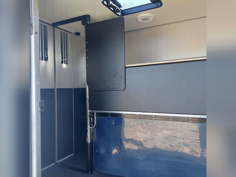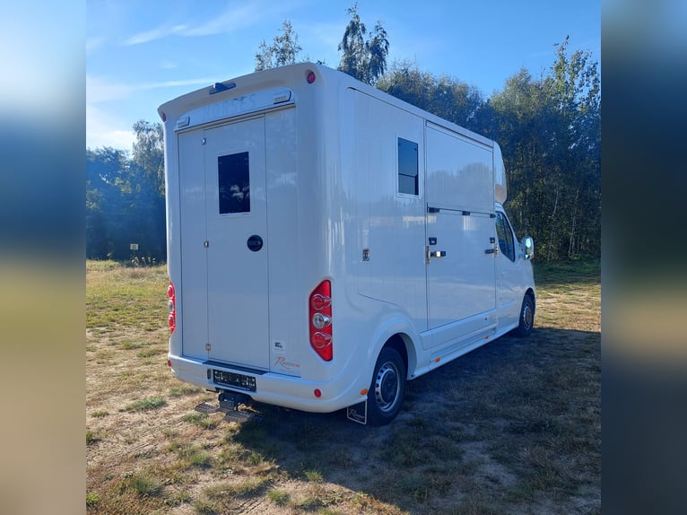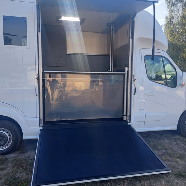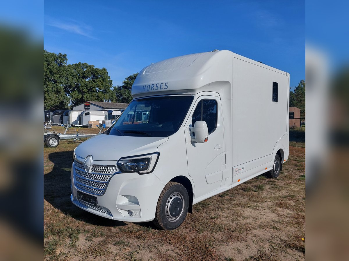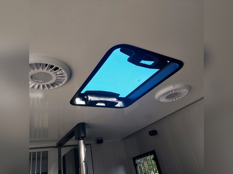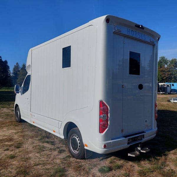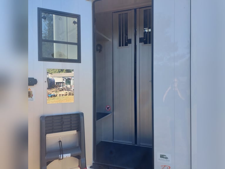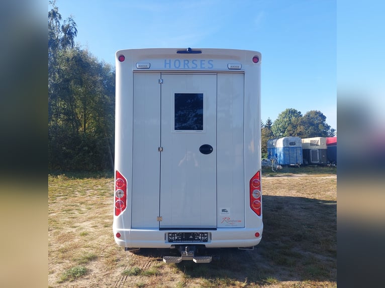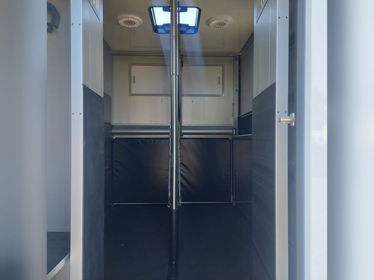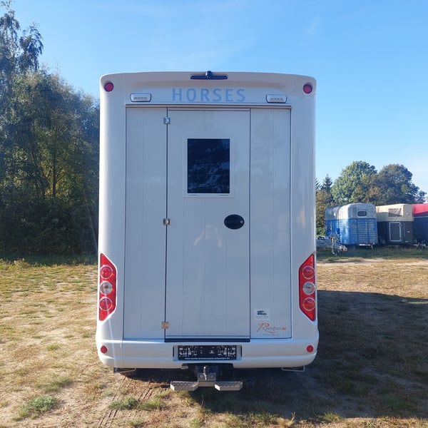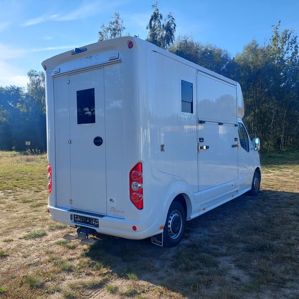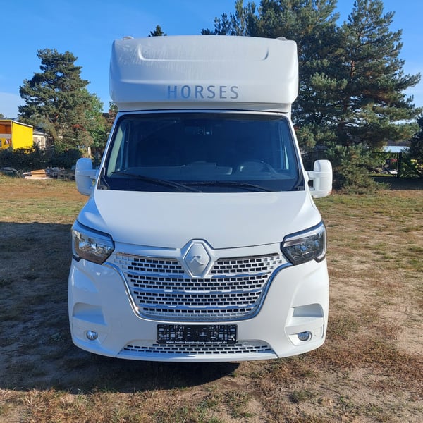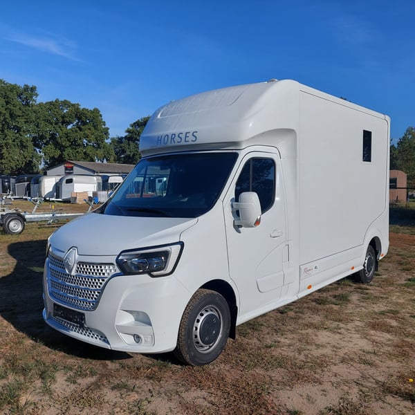 We are selling a new Roelofsen horse trailer... NEW VEHICLE!! Immediately available at a special price! *** NET PRICE *** plus 19% VAT. - Foldable head partition - Fabric seats - Permissible total weight: 3500 kg - Diesel - Air conditioning - Cruise control - Tow hitch - Towing capacity: 2500 kg - 3-seater - Navigation system - Video surveillance The Parados is standardly equipped with: Walls made of anodized aluminum Honeycomb core plastic construction with soft rubber flooring Large side ramp (right side) with soft rubber floor, lifting aid, and a flap Entrance door in the rear structure (lockable) with vertical sliding window 2 vertical sliding windows, one roof hatch, and 2 fans Tie ring on the right outer wall Temperature monitoring in the horse compartment Horse compartment: Impact protection on the wall to the driver's cab up to 1.30 meters Aluminum partition wall Sliding system for the partition wall Kick cushion under the rail system Storage compartment above the driver's cab with sliding doors Stainless steel locking bar with PVC cover LED lighting with day and night light Stainless steel chains with panic closure Horse compartment interior height 2.38 meters Luxurious saddle room: 4 bridle hooks 2 saddle holders Coat hook Shelf system Step Mirror Delivery by arrangement, trade-in and financing gladly possible Viewing/pick-up in 16845 Großderschau by appointment at 033875-909588 anytime possible! Opening hours: Monday - Friday 8:00 AM - 5:00 PM