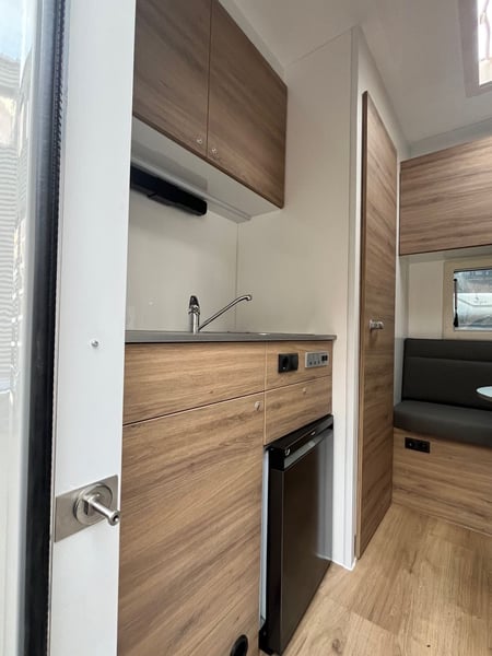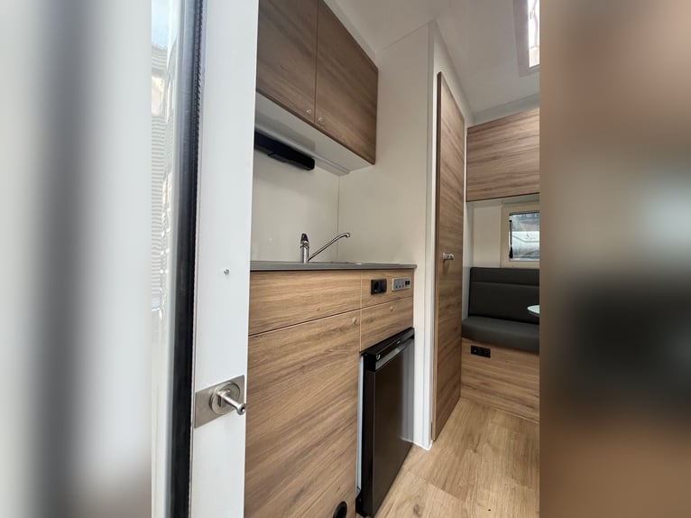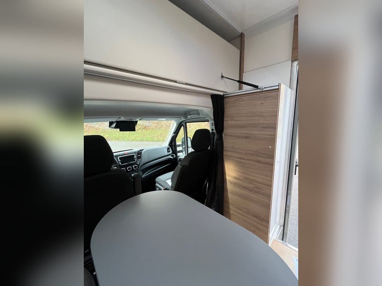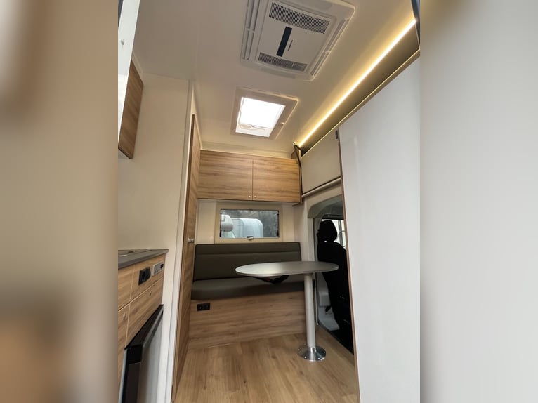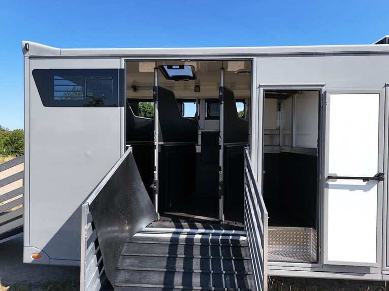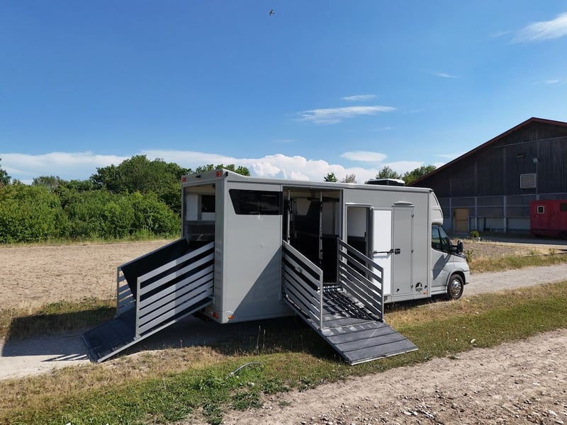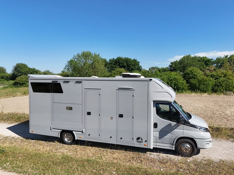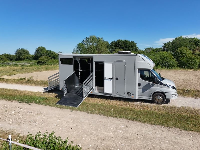 IVECO Daily RJH SportPro H3 Horse Transporter for up to 3 Horses with Living Cabin 7.2 tons permissible total weight, first registration 11/2024, only approx. 7,500 km, automatic, diesel, Euro 6, heated seats, air suspension at the rear, multimedia with Bluetooth and navigation system, Apple CarPlay, and much more. Driver's cabin breakthrough, separate bathroom with shower and toilet, foldable top sleeper bed for 2 persons, seating area with ergonomically shaped table, kitchen block with sink, microwave, refrigerator. 3 cross stalls plus storage space for saddles and other equipment, side and rear ramp with easy-lift system and aluminum ramp limiters, overhead compartment above the horse's back, surveillance camera in the horse area, ceiling lighting as well as LED ramp spotlights, adjustable roof hatch and electric fan. Already equipped extras: Preparation for electric connection for winch Air conditioning Roof window in top sleeper Paint in Porsche Chalk Battery charger for vehicle battery Code lock Further information and pictures available upon request! Errors and prior sale reserved.