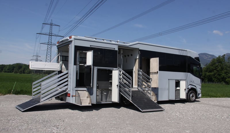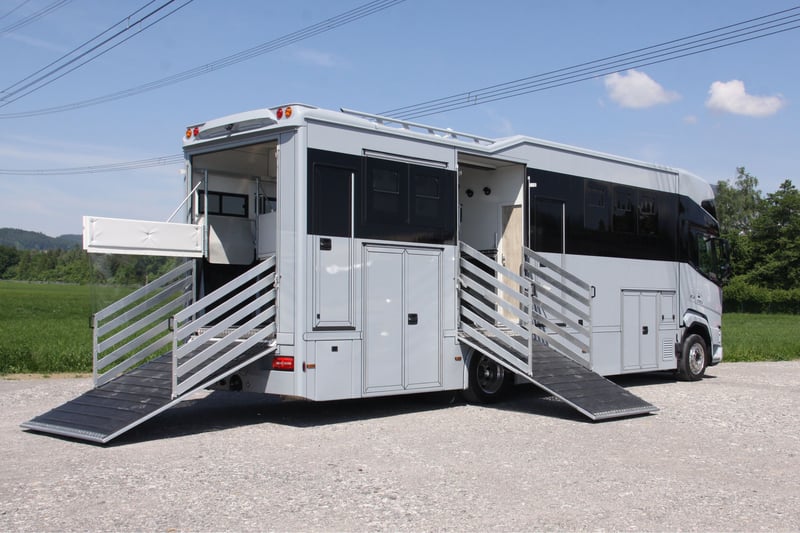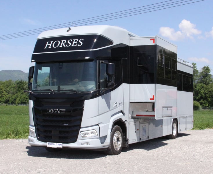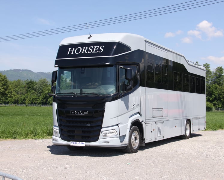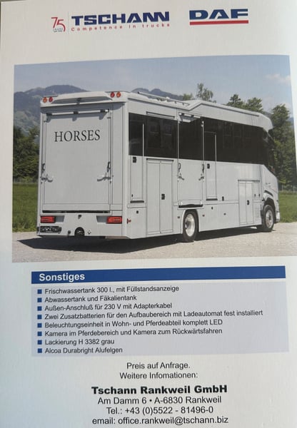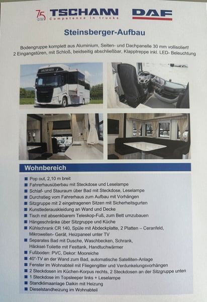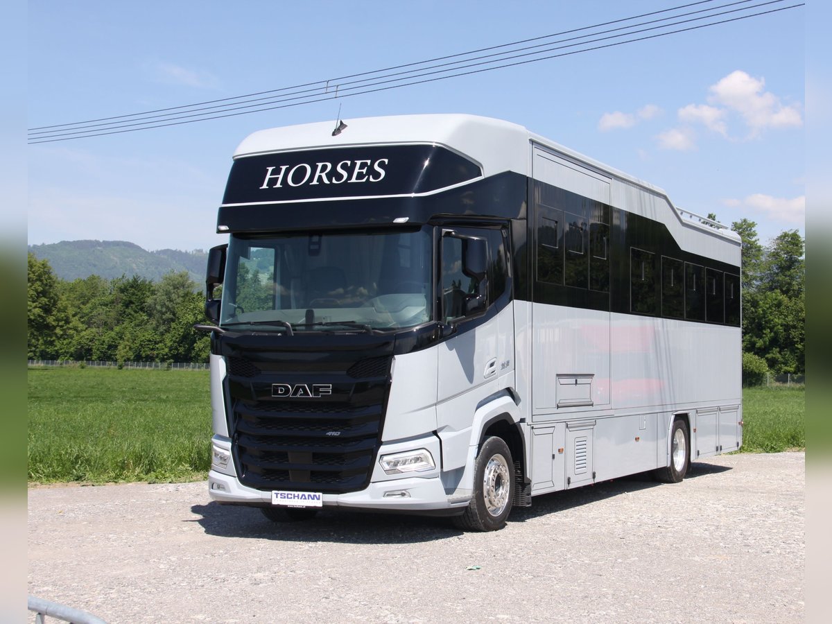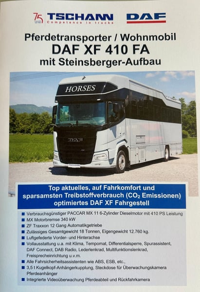 Transporter koni/ Camper DAF XF410 z zabudową Steinsberger dostępny od zaraz Nowy pojazd, ciężarówka z automatyczną skrzynią biegów, pełne zawieszenie pneumatyczne, na 5 koni
