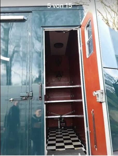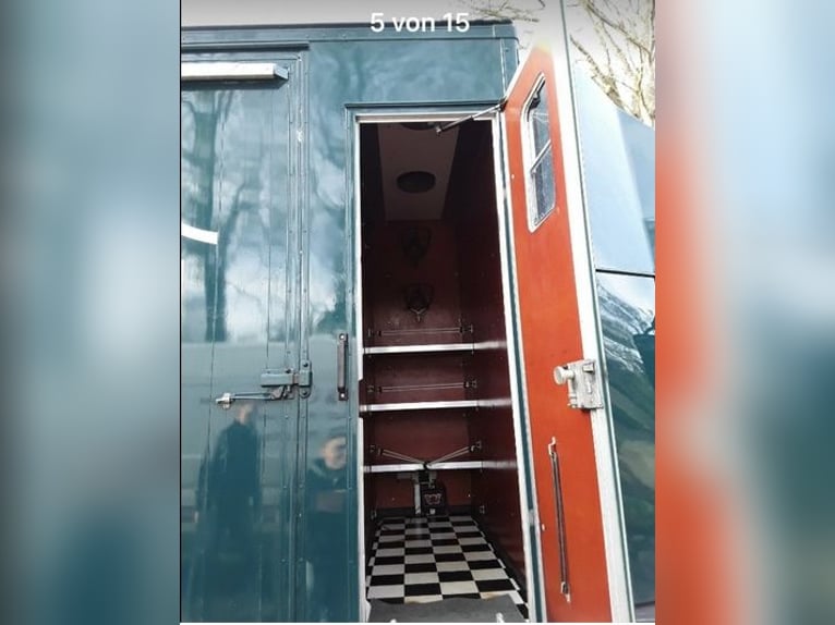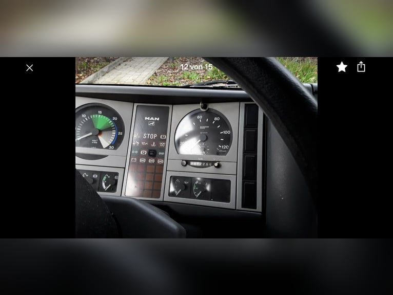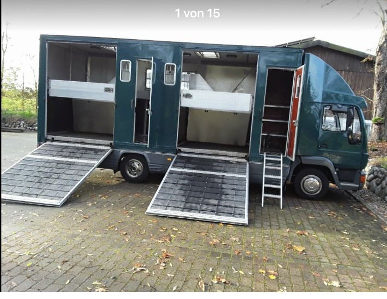 MAN L2000 avec carrosserie Steinsberger pneus neufs 2 rampes latérales avec grilles de rampes, faciles à manœuvrer, complètement ensachées (forme méga) Compartiment pour chevaux entièrement monté sur tôle striée en aluminium, protection périphérique contre les chocs, rembourrée et recouverte de caoutchouc Cloisons de séparation en alu mangeoires entièrement en alu au centre avec couloir d'alimentation Sellerie en bois. (Une armoire en acier peut être tirée dans la sellerie à l'aide d'un treuil et d'une rampe). Porte-selles, porte bridons Étagères intégrées pour couvertures, guêtres, etc. AHK 3,5 tonnes Cabine très bien entretenue