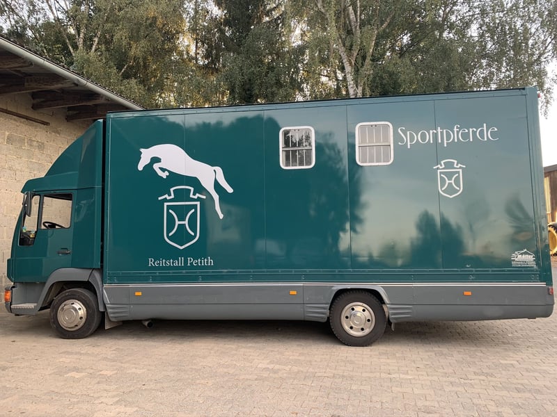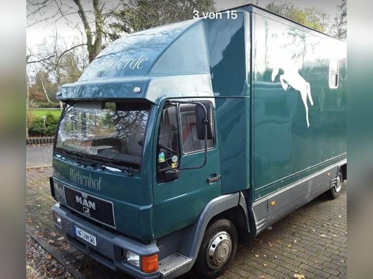 MAN L2000 with Steinsberger body, new tyres 2 side ramps with ramp grilles, smooth-running fully spoiled (mega shape) Horse compartment completely circumferential on aluminium checker plate impact protection, padded with rubber cover Partition walls made of aluminium Mangers made entirely of aluminium in the middle with feeding aisle Tack room. (A steel cabinet can be pulled into the tack room via winch and ramp) Saddle holders, snaffle holders, built-in shelves for blankets, gaiters, etc. AHK 3.5 tons Driver's cab very well maintained