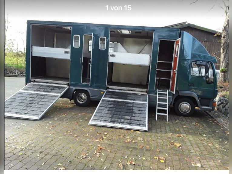 MAN L2000 con carrocería Steinsberger, neumáticos nuevos 2 rampas laterales con rejillas de rampa, de funcionamiento suave totalmente estropeadas (mega forma) Compartimento para caballos completamente circunferencial sobre protección contra impactos de placa estriada de aluminio, acolchado con cubierta de goma Tabiques de aluminio Pesebres fabricados íntegramente en aluminio en el centro con pasillo de alimentación Guardarnés. (Un gabinete de acero se puede introducir en la sala de arreos a través de un cabrestante y una rampa) Soportes para sillas de montar, soportes para lazos, estantes empotrados para mantas, polainas, etc. AHK 3,5 toneladas Cabina del conductor muy bien mantenida