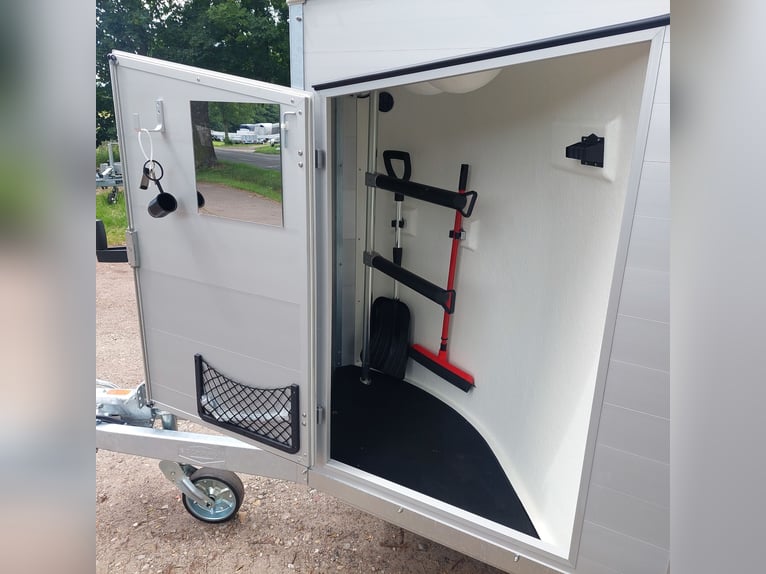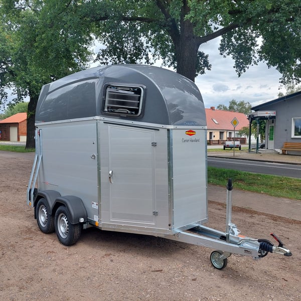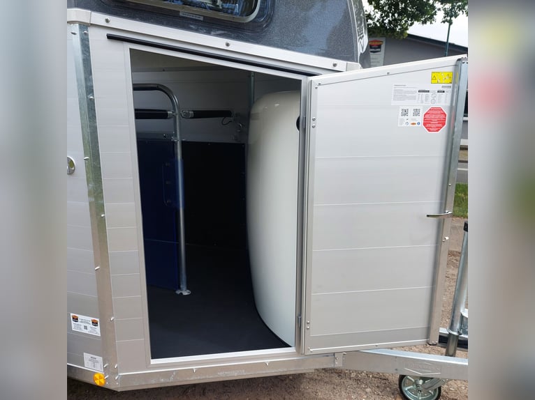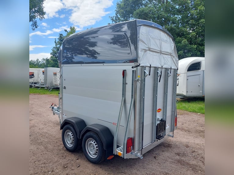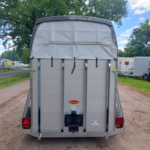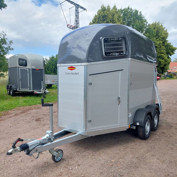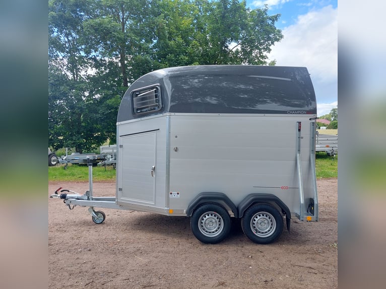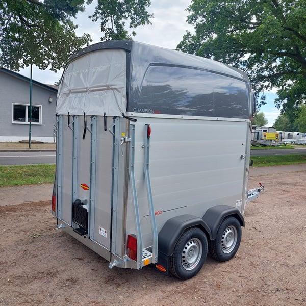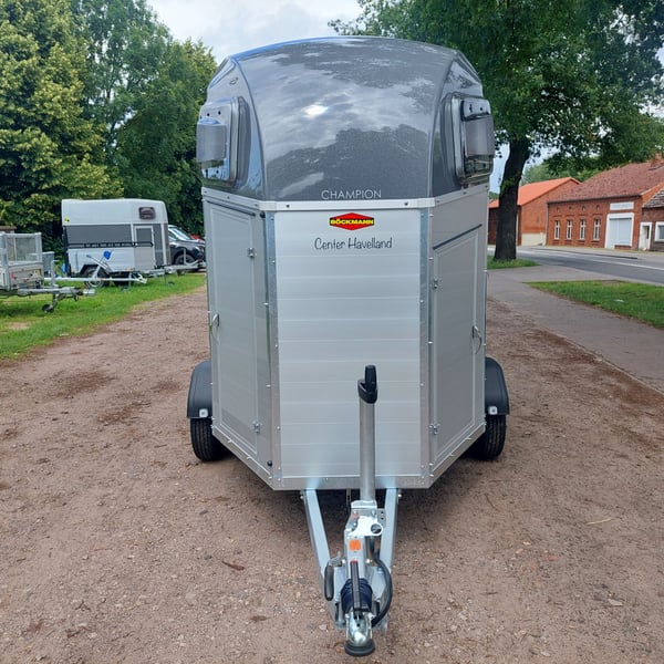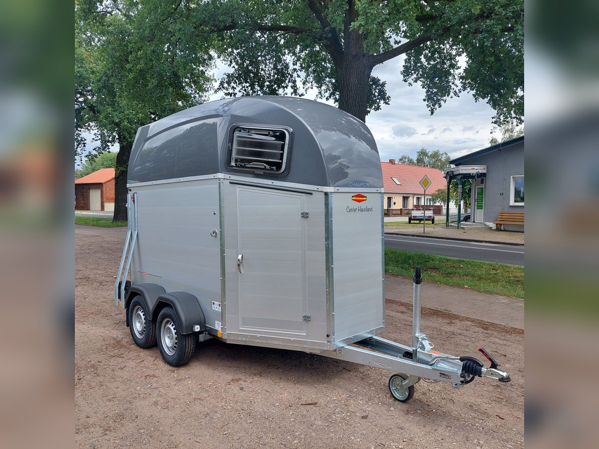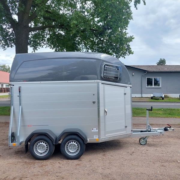 We are selling a new Böckmann Champion Esprit ECO with a tack room at a special price in slate grey metallic! - GVWR: 2400 kg - Unladen weight: 835 kg - Payload: 1565 kg - Original Böckmann full aluminum floor - Tack room - Tarpaulin lift - Interior lighting blue & white - Side step protection - Automatic jockey wheel - Shock absorbers for 100 km/h approval - Rubber floor glued and sealed - Lighting system with reversing lights and 13-pin plug !More new and used horse trailers in stock! Vehicle registration document shipping for registration possible in advance for an additional charge of €5! Viewing/pick-up in 16845 Großderschau by appointment under 033875-909588 possible at any time! Delivery by arrangement, trade-in, and financing available. Opening hours: Monday - Friday 8:00 AM - 5:00 PM