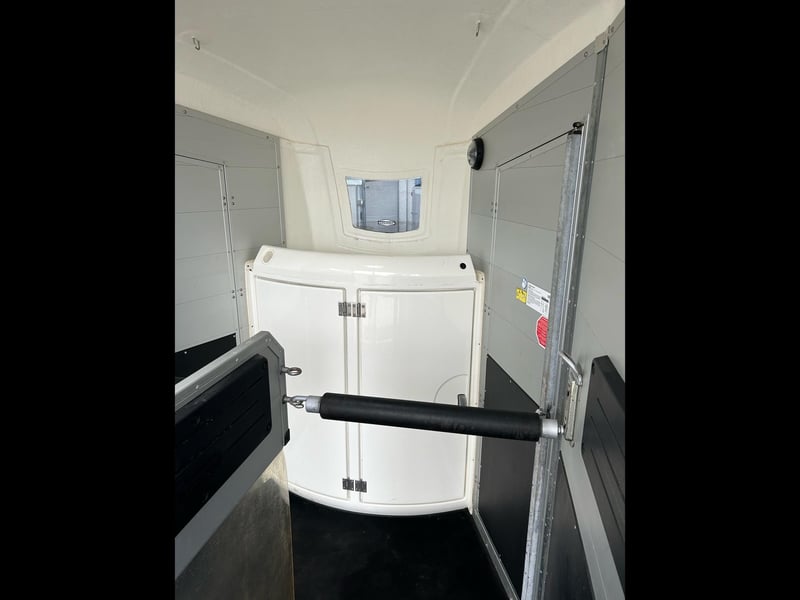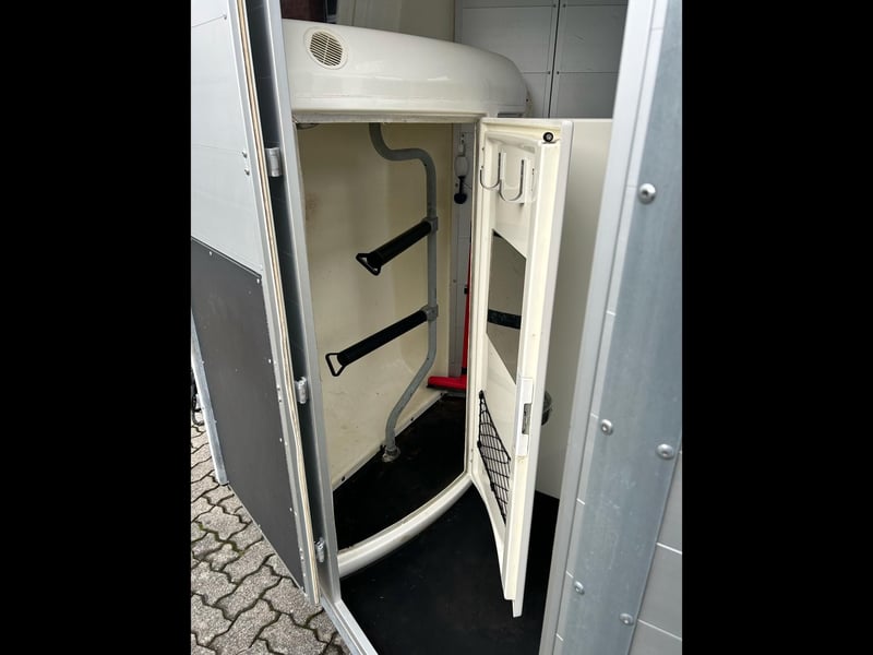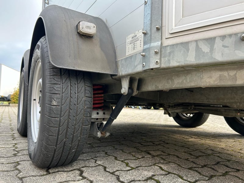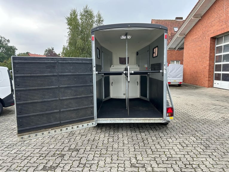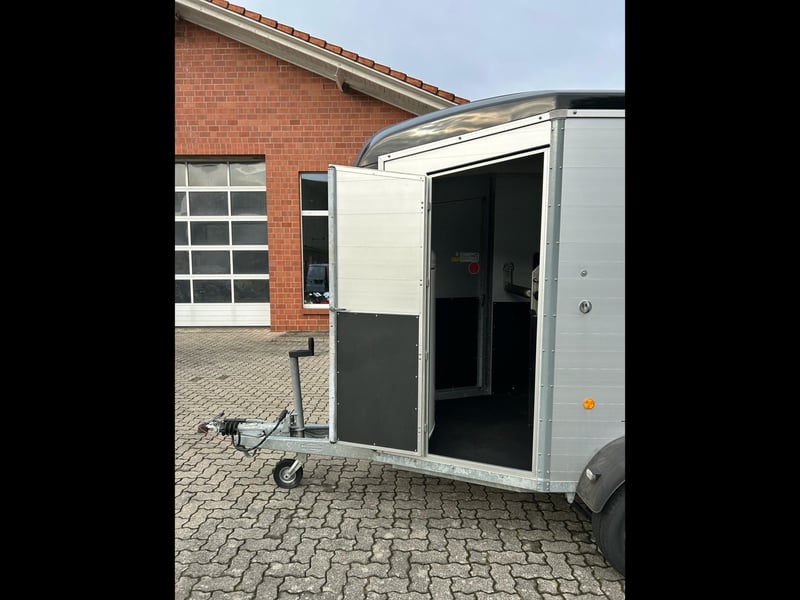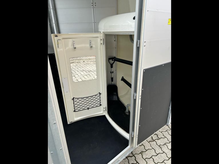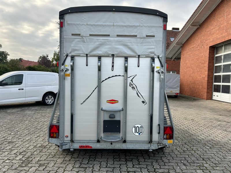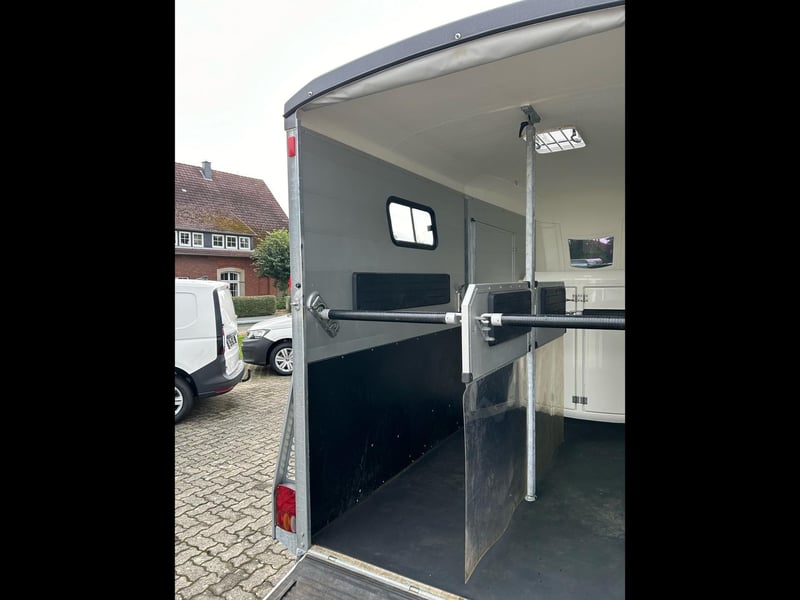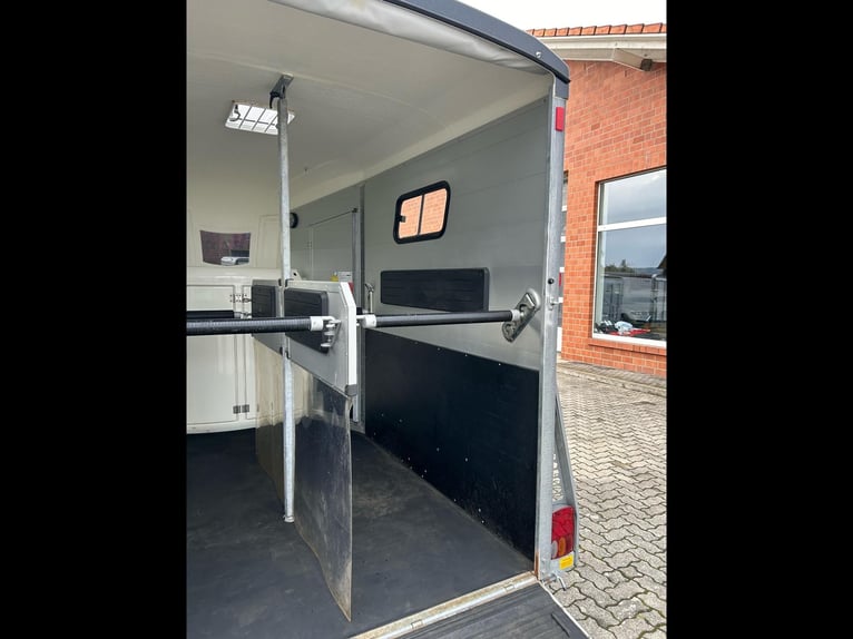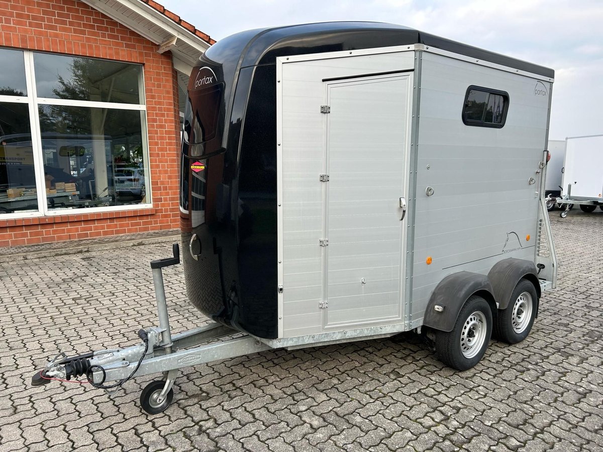 Böckmann Portax E Horse Trailer Car Trailer First registration: May 2016 HU (inspection): February 2027 Year of manufacture: 2016 Number of previous owners: 2 Including registration documents (vehicle registration certificate Part I and II, COC) Available immediately (in stock)! Price: VAT not shown according to §25a (margin scheme) Financing available through our partner banks! Technical Data Maximum permissible gross weight: 2,400 kg Unladen weight: approx. 1,079 kg Payload: approx. 1,321 kg Number of axles: 2 Loading length: 3,460 mm Loading width: 1,750 mm Loading height: 2,300 mm Braking system: Braked, overrun brake Chassis: Low loader (wheels beside the body) Electrical system: 12V, 13-pin connector Tire size: 195/70 R14 Features Rear door rotatable and pivotable Stable with two doors, saddle rack foldable and removable, shovel and broom storage Center post partition with padding, pivotable at front and rear Side padding left and right WCF chassis including shock absorbers (approved for 100 km/h) Aluminum floor Rubber flooring Side step protection Body constructed from aluminum profiles Interior lighting Man-height entry doors on both sides Overrun coupling with rubber step strip Split and height-adjustable front and rear bars with panic latch release Side sliding windows Polycarbonate hood and front in black Tarp lift with integrated net Panoramic front window Roof vent Horse net rings Automatic jockey wheel Zinc-plated frame V-shaped drawbar Optional accessories (additional cost) Vehicle delivery across Germany (quote for individual transport price available) Registration within a 25 km radius (car dealership Möller) Nationwide registration (registration service) Export license plates (valid for 15 days) Export license plates (valid for 30 days) Transit plates (valid for 5 days) Customs registration Sending vehicle registration documents for registration (deposit required)