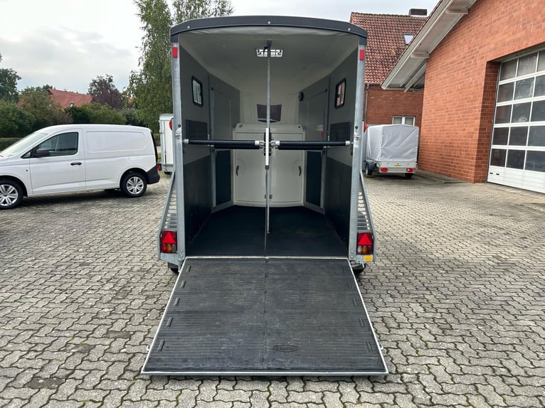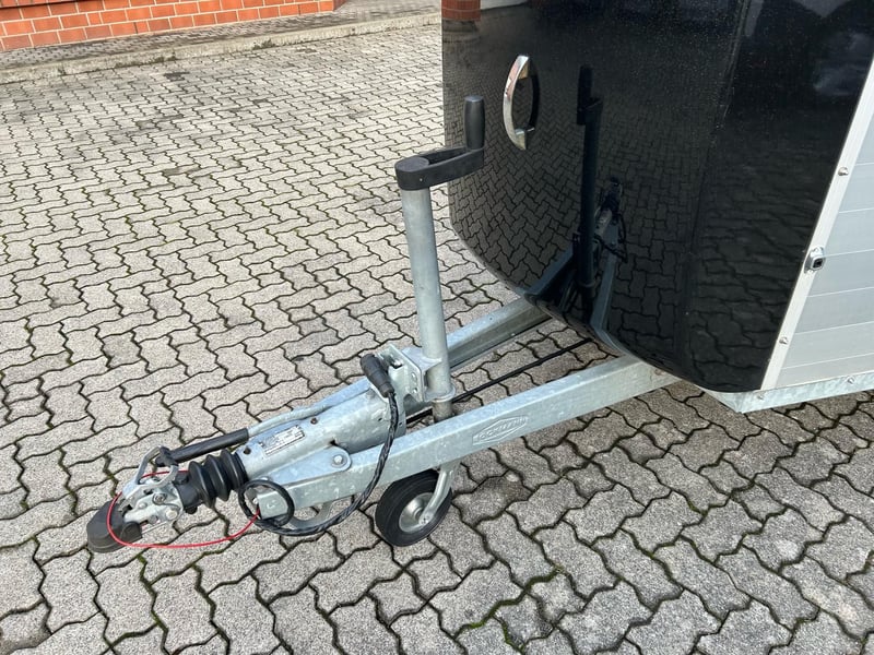 Böckmann Portax E Pferdeanhänger PKW Anhänger Erstzulassung: Mai 2016 HU: Februar 2027 Produktionsjahr: 2016 Anzahl Vorbesitzer: 2 Inkl. Zulassungspapiere (Kfz-Brief / Kfz-Schein / Zulassungsbescheinigung Teil 1 und 2 und COC) Verfügbar ab: Sofort (auf Lager)! Preis: Differenzbesteuerung / MwSt. nicht ausweisbar (§25a) Finanzierung über unsere Partnerbanken möglich! Technische Daten Zulässiges Gesamtgewicht: 2.400kg Leergewicht: ca. 1.079kg Nutzlast: ca. 1.321kg Achsenanzahl: 2 Laderaumlänge: 3.460mm Laderaumbreite: 1.750mm Laderaumhöhe: 2.300mm Bremsenart: Gebremst, Auflaufbremse Fahrgestell: Tieflader (Räder neben Aufbau) Elektrik: 12V, 13 poliger Stecker Reifengröße: 195/70 R14 Ausstattung Hecktür dreh- und schwenkbar Sattelkammer mit 2x Türen, Sattelhalter schwenk- und herausziehbar, Schaufel und Besen Mittelpfosten-Trennwand mit Polsterung, hinten und vorne schwenkbar Seitenpolsterung links und rechts WCF-Fahrwerk inkl. Radstoßdämpfer (100 km/h-Zulassung) Aluboden Gummiboden Seitentrittschutz Aufbau aus Aluminiumprofilen Innenbeleuchtung Mannshohe Einstiegstür rechts und links Auflaufklappe mit Trittleistengummi Geteilte und höhenverstellbare Brust- und Heckstangen mit Panikentriegelung Seitenschiebefenster Polyhaube und Bug in Black Planenlift mit integriertem Netz Panoramafenster vorne Dachlüfter Heunetzringe Automatisches Stützrad Rahmen verzinkt V-Deichsel Zubehör (aufpreispflichtig) Fahrzeuganlieferung deutschlandweit (Angebot für individuellen Transportpreis gewünscht) Zulassung Umkreis 25km (Durchführung Autohaus Möller) Zulassung deutschlandweit (Durchführung Zulassungsdienst) Ausfuhrkennzeichen (15 Tage gültig) Ausfuhrkennzeichen (30 Tage gültig) Überführungskennzeichen (5 Tage gültig) Zollanmeldung Zusendung Kfz-Papiere zwecks Anmeldung (Anzahlung erforderlich)