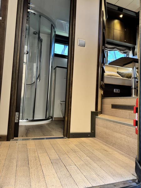 STX IVECO Stralis samochód ciężarowy z przyczepą konną i mieszkaniem, łazienką z toaletą i prysznicem, przeznaczony dla 3-4 koni, dopuszczony do jazdy z prędkością 100 km/h, z 5 miejscami siedzącymi Silnik pojazdu w doskonałym stanie, regularnie serwisowany. Cena 108 100 CHF Pierwsza rejestracja 03/2009, około 140 559 km, moc 265 kW (360 KM), automatyczna skrzynia biegów, masa własna 13,9 t, dopuszczalna masa całkowita 18 t, badanie techniczne ważne do 08.2024, dopuszczalna masa przyczepy 3 500 kg, system monitoringu dla koni i kamera cofania, wskaźnik temperatury w części dla koni, skórzane siedzenia Przepiękne, przestronne mieszkanie z możliwością zakwaterowania do 6 osób, dużym łóżkiem typu top sleeper, klimatyzacją, ogrzewaniem postojowym, aneksem kuchennym z umywalką, lodówką, płytą grzewczą i mikrofalówką, wieloma szufladami i szafkami, dodatkowym łóżkiem nad łazienką, nowym generatorem diesla i innymi udogodnieniami. Oddzielna łazienka z prysznicem, umywalką, lustrem, szafką, toaletą i wieszakami na ręczniki, podłogowe ogrzewanie. Dodatkowa, przestronna rozbudowana część z rozkładanym łóżkiem 140 cm i dużymi szafami wnękowymi, klimatyzowana. Wszystkie materace bardzo wygodne i w stanie niemal nowym. W zestawie dodatkowa ochraniaczka molton i dopasowane poszewki. Przedział dla koni na 3-4 konie, z wyściełanymi, regulowanymi ścianami, wciągarką do transportówki, wbudowanymi automatycznymi poidłami, bocznymi oknami z kratami, oknem dachowym, oświetleniem i wentylatorem, rampą z ogranicznikiem. Zewnętrzny prysznic z wężem do spłukiwania i mała umywalka obok dużej skrzyni na sprzęt jeździecki. Wiele schowków i dodatkowych gniazdek z boku pojazdu. Napisy będą jeszcze usunięte. Więcej informacji i zdjęć chętnie udostępnimy na życzenie! Kontakt: 0794305031