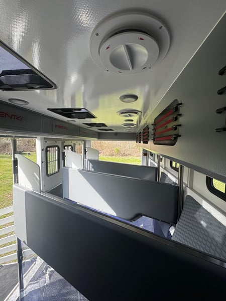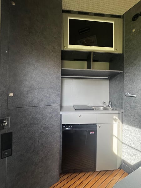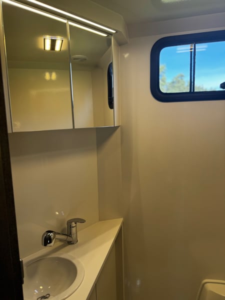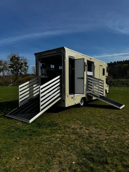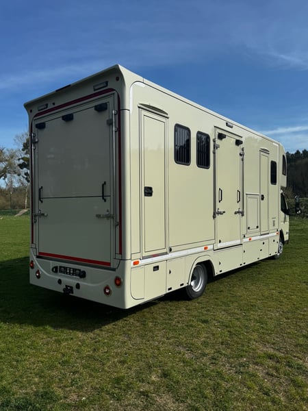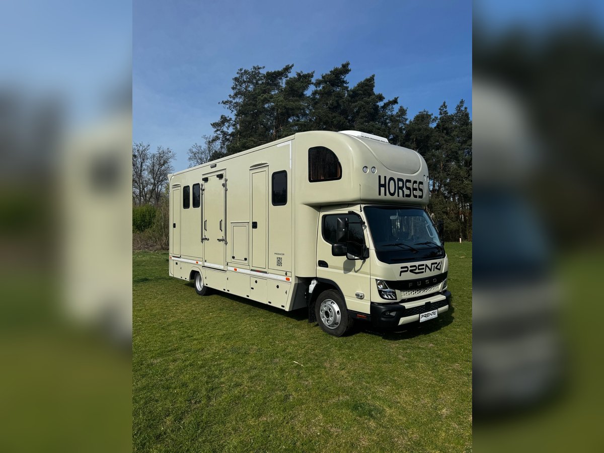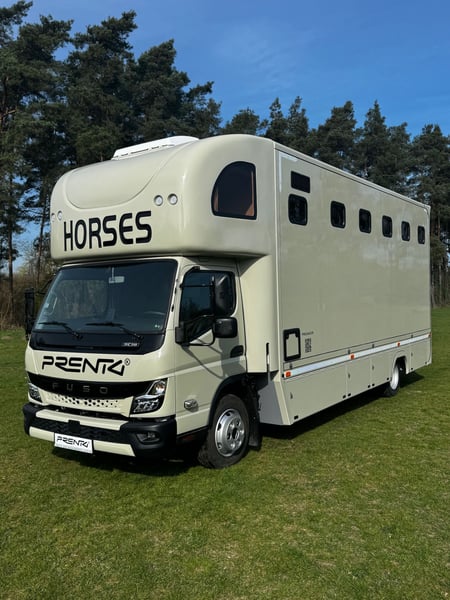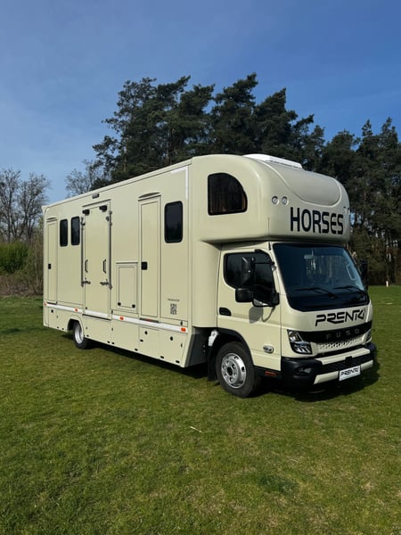 New Mitsubishi Fuso PRENTKI horse transport truck Polish FUSO Horse Carrier / PRENTKI Fuso Canter 9C18 Number of seats - 3 people Ability to transport horses - 3 or 4 horses Registration DMC - 7490 or 8550 kg- (we have approval) Weight of the vehicle ready to drive - 5900 kg Body specifications External dimensions of the car: ✓Length - 8100 mm ✓Width - 2350 mm ✓Height - 3500 mm Dimensions of the social compartment: ✓Length -2200/1000 mm ✓Width -2200 mm ✓Height - 2420 mm Dimensions of the horse compartment: ✓Length - 4680 / 3550 mm ✓Width - 2200 mm ✓Height - 2420 mm Equipment of the social compartment: Entrance door 550 x 1950 mm with window 630 x 330 mm ➢THULE electric folding step 12V ➢Floor lined with HPL panel ➢Window in side wall 630 x 470 mm Furniture built-in: ✓Wardrobe cabinet ✓Kitchen countertop ✓Hob 230V Adler cooktop ✓Single-bowl sink ✓ViGO COOL 12 V 65 L refrigerator ✓Television 32 '' ✓Television with terrestrial TV ✓Wall heating curtain 230V 2 KW ✓Procool 3000 air conditioner powered 230 V cooling power 2,65 KW ✓Procool 3000 heater powered 230V heating power 2,8 KW ✓Seating window with 12V fan ✓2 LED ceiling lights 12 V ✓Folding table for sleeping function ✓2 benches with cushions ✓Puff ➢Fair over the cabin : ✓Suitable for sleeping for 2 people ✓Side fixed windows ✓ MIDI HEKI 700 x 500 opening roof window with mosquito net ✓Reading lamps ✓USB sockets ➢Bathroom: ✓Shower basin ✓Toilet with pull-out tank on the outside ✓Cabinet with sink ✓Hanging cabinet with mirror ✓Fan ✓Removable side window ➢Electrical installation: ✓ 230 V sockets ✓USB sockets ✓Voltronic control panel indicating clean and dirty water tank levels and battery voltage status ➢Water system: ✓Clean water tank 95 L ✓Dirty water tank 95 L ✓Terma 15 L 1.5 KW Horse compartment equipment: ➢Tailgate frame with guards 1850 x 2250 mm ➢Side frame with guards 1150 x 2250 mm ➢Front door with window 630 x 330 mm ➢Manually opening entrance step ➢3horse partitions ➢Customizable handle with DRAGON 2000ST 12 V winch ➢2 windows with bars on the horse head side 630 x 470 mm ➢5 windows on horse rump side 330 x 480 mm ➢4 12 V fans ➢4 glass roof windows opening manually ➢9 LED lights 12 V white / blue ➢Camera ➢Top trunks over horse rumps ➢Floor covered with rubber with 8 mm thick textile divider ➢Side walls up to 1 m high covered with rubber with 5 mm thick textile interlayer External equipment: ➢Side storage compartment for saddles with flap opening upwards ➢Side lower trunks - 4 pieces ➢Side trunk with fuses and additional 200 AH battery ➢Halogen lights above the entrance door and ramps ➢Rearview camera ➢Towing hook 3.5 T ➢Installation to connect monitoring to the trailer ➢External 230 V connection Warranty on the body 24 months Negotiable price Possible leasing PRENTKI Przedsiębiorstwo Wielobranżowe is currently an authorized manufacturer of Renault-branded bodies, including medical ambulances, camper vans, courier vans or store vans. The main and most thriving branch of the company's development is the bodywork of new horse-drawn vehicles on the Renault Master platform. The company has already built more than 1,000 such vehicles and continues to strengthen its position on the Polish market and abroad. When deciding to buy and use PRENTKI vehicles, customers choose well thought-out designs and solutions backed by years of experience. We place absolute emphasis on the safety and functionality of our vehicles. All materials used in the production of bodies are certified, and the construction solutions used in them pass tests, as evidenced by obtaining EC type approval for the vehicle. On March 01, 2019, our company was certified to meet the requirements of ISO 9001:2015. In 2003, the PRENTKI company obtained the PN-EN ISO 9001:2001 quality system certificate.