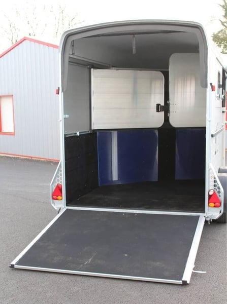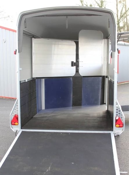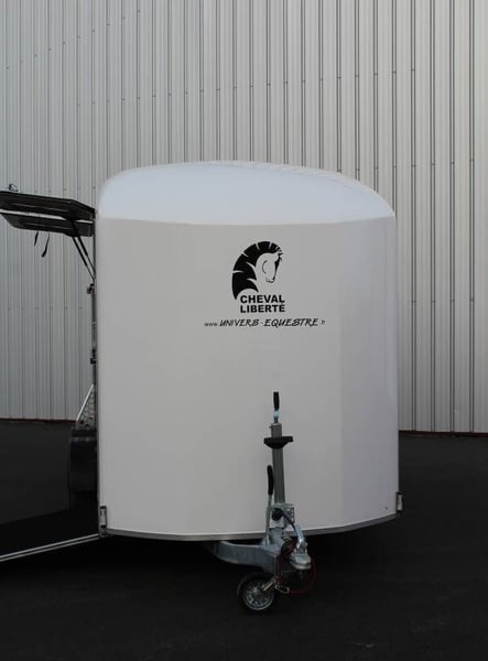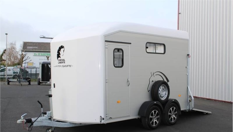 VAN DUOMAX CHEVAL LIBERTE 2 PLACES DIAGONAL Au choix lors de la commande : – Séparation étalon OU – Séparation télescopique Equipement de série : • Châssis suspension Pullman 2 • Plancher aluminium • Parois aluminium anodisées • Sortie pont avant avec volet supérieur, fenêtres coulissante 400×500 intégrée avec barreaux de protection inox • Volet latéral avec fenêtres coulissante 400×500 intégrée avec barreaux de protection inox. • Fenêtre supplémentaire coulissante de ventilation 800×250 côté gauche. • Pont/porte arrière, bâche à enrouleur automatique ventilée. • Vaste compartiment sellerie avec grande porte d’accès intégrant une fenêtre de ventilation 300×400. • Double porte selle sur rail coulissant, porte filets et porte brides, porte document, miroir de courtoisie, éclairage. • Barre d’attache latérale en inox, à droite. • Roue de secours (installée dans la sellerie). • Roue jockey automatique escamotable, poignée de manoeuvre. • Roues jantes métal 185/65R14 • Ailes antichocs. • Séparation demi bat flanc aluminium avec séparation de tête, fermeture par sangle cuir. Barre de recul. • Disponible en plusieurs coloris : Blanc /gris silver / gris anthracite / rouge / noir • Longueur extérieure : 5,03 m • Largeur extérieure : 2,29 m • Longueur intérieure : 3,78 m • Largeur intérieure : 1,81 m • Poids à vide : 960 kg • PTAC : au choix 1400 à 2600 kg Options, montée à l’usine : Séparation sup. télescopique ou étalon (CZ000778) : 960 € Options : 2ème barre d’attache latérale en inox (CZ000436) : 319 € Hayon blanc arrière au-dessus du pont (CZ000518) : 500 € Jantes alu (PTAC max. 2500 kg) (JANTESALU14X4) : 690 € 3 sur tapis caoutchouc 1 x 2 m (CZ000032) : 480 € Barre d’éloignement (BARREELOIGNEMENT) : 420 € Caméra WIFI (CAMERA) : 220 € Antivol de tête (6775) : 47 €