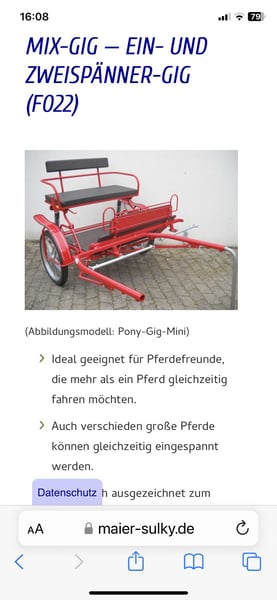 Weihnachten steht vor der Tür - machen Sie auch Ihren Traum vom "Maier Gig" wahr. Leider muss ich mich von diesem Traum-Gig trennen, da ich das zweispännig fahren aufgeben muss. Sie haben deshalb die Chance diesen neuwertigen Gig der Fa. Maier Sulky Sport München so gut wie neuwertig zu kaufen. Konnte ihn leider zweispännig nicht mehr fahren und nur einige Male einspännig. Seit gut einem Jahr steht er nun abgedeckt und trocken in der Scheune und wartet auf seinen neuen Einsatz. Zum Rumstehen viel zu Schade, da wir kein passendes Pony mehr haben. Für den Transport ist nicht zwingend ein Pferdeanhänger erforderlich, wir haben ihn in einem Ford Transit von München in die Heimat gebracht. Eventuell auch Tausch gegen Einspänner-Gig oder Kutsche möglich.