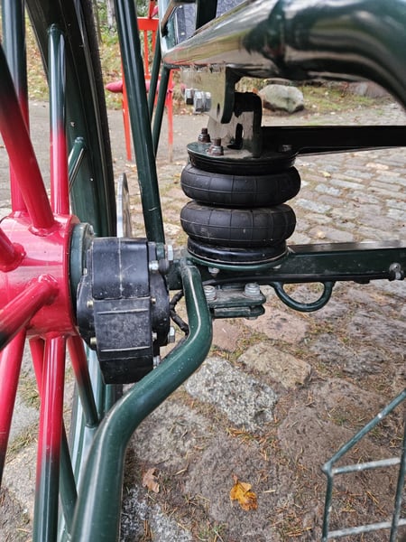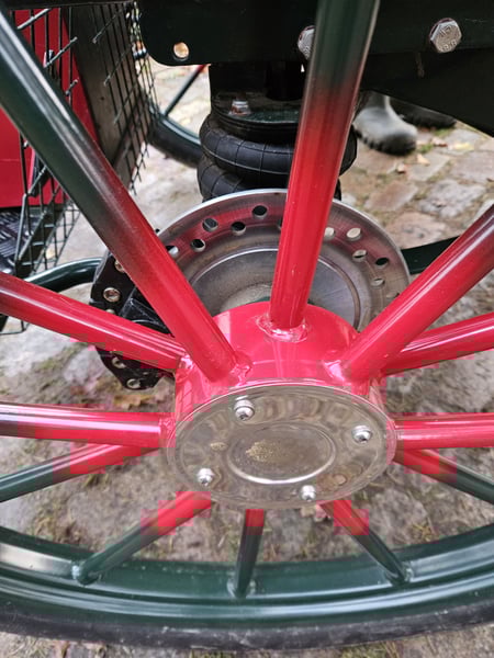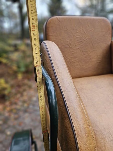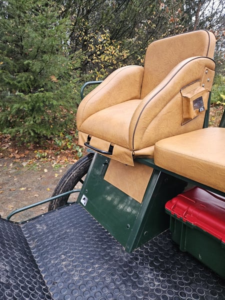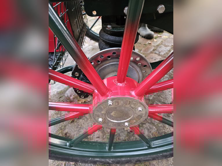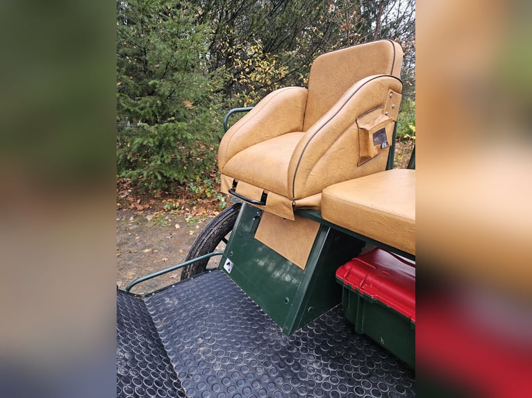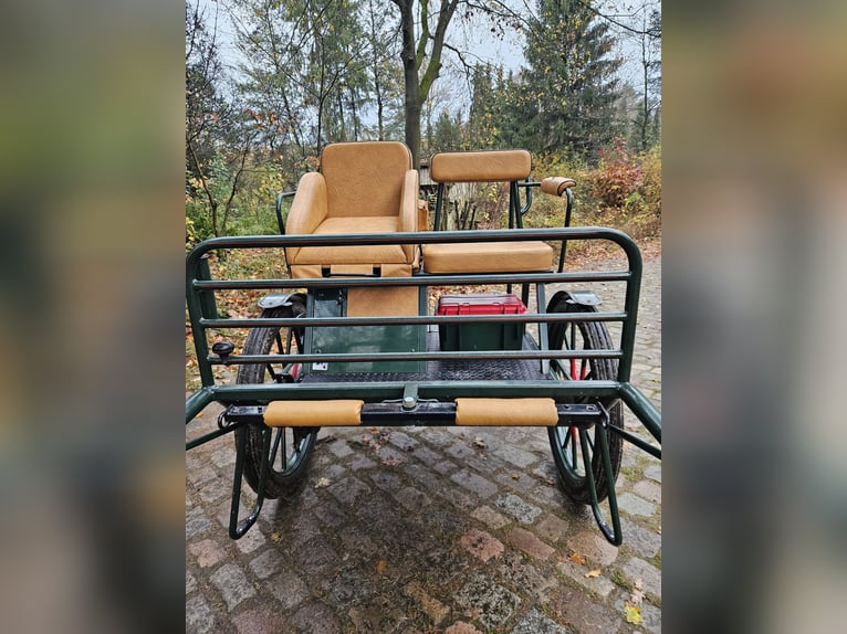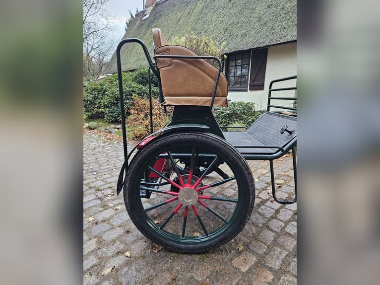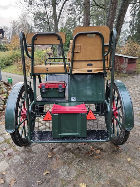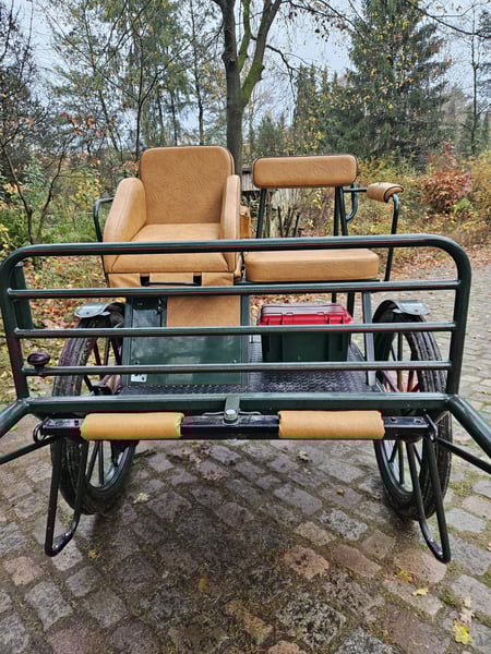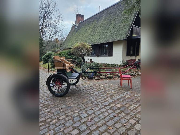 Te koop: een gig met een speciaal model, omdat de achterbank niet doorloopt, maar voorzien is van een verstelbare bestuurdersstoel van 1,30 m hoogte. Uitgerust met 29-inch luchtbanden, schijfremmen, lichtlopend en goed uitgebalanceerd. Geschikt voor grote paardenrassen zoals Tinker, Noriker, Friese paarden en stevige Haflingers. Voorzien van afsluitbare opbergruimtes en kisten.