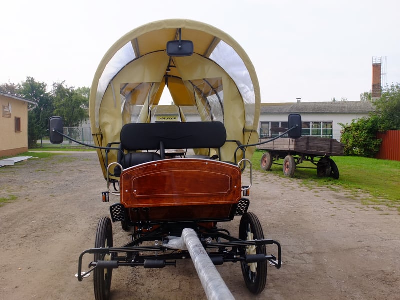 Piękny duży wóz, nowy, odpowiedni dla całej rodziny i na krótkie przejażdżki towarzyskie. Koła: 25-calowe o profilu ulicznym, hamulce tarczowe z wentylacją, hamulec korbowy, oświetlenie LED, oświetlenie wewnętrzne, duża komora bagażowa pod spodem, przedłużane siedzenia z tyłu o długości 2,50 m. Podwójne schody z tyłu do składania. Przeznaczony dla koni o wysokości od 145 cm do 170 cm. Stale dostępne nowe karety w różnych wersjach. Na życzenie możemy również wyprodukować karety według Państwa indywidualnych wymagań. Ponadto wciąż oferujemy konie do jazdy i rekreacji w różnych kolorach i rozmiarach. Tel.: 0173-3843407 Prosimy o telefoniczne kontakt, nie wysyłać maili! Możliwość częściowej płatności przy zakupie karety!