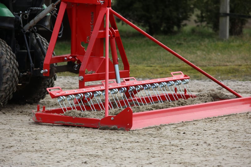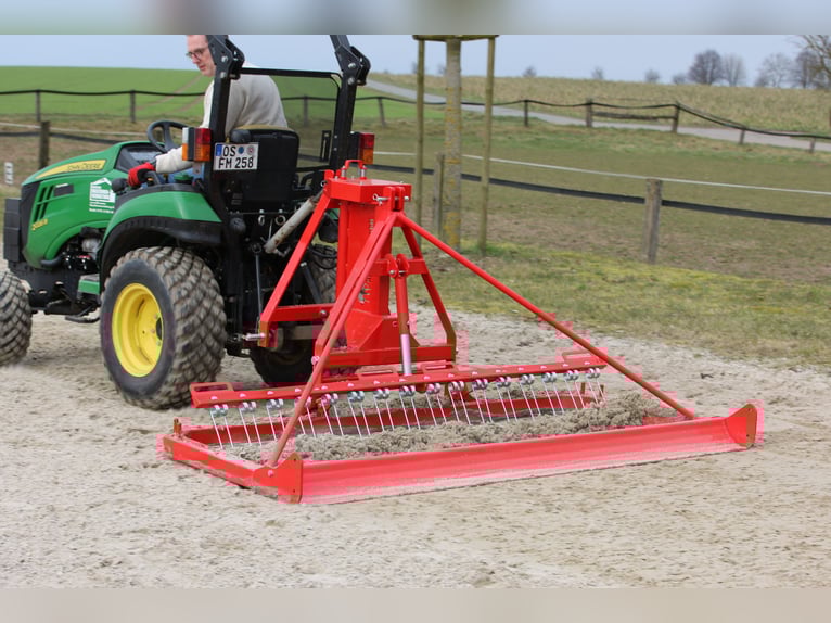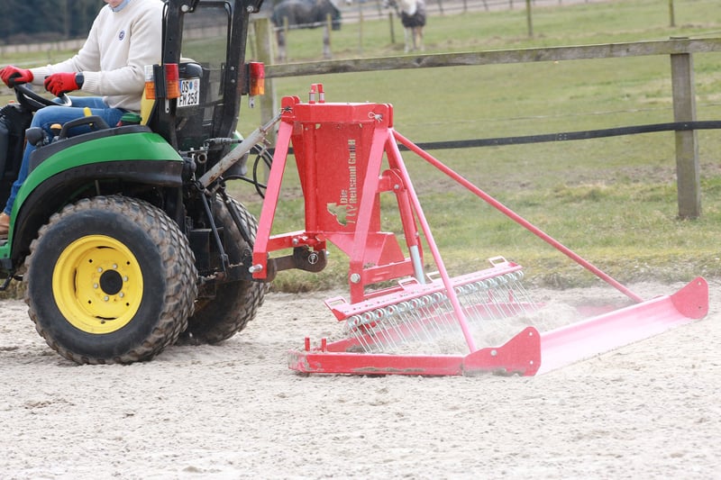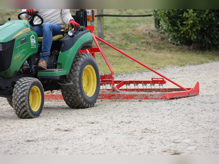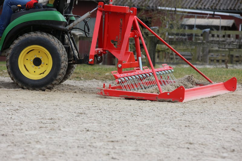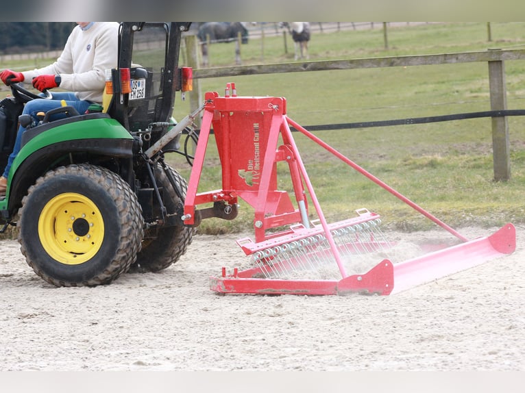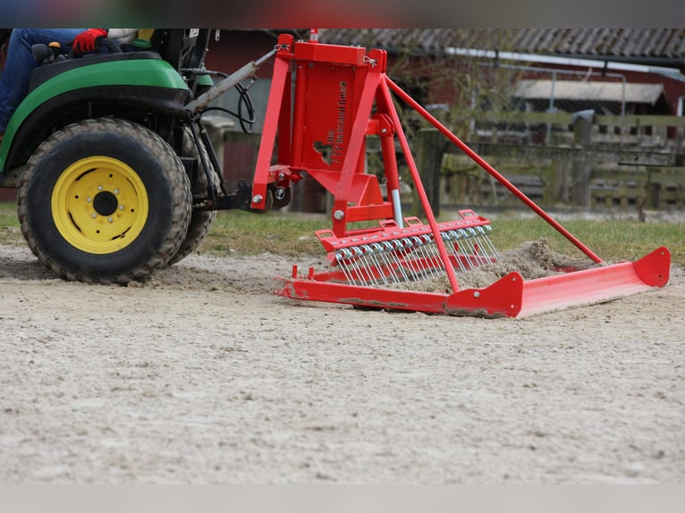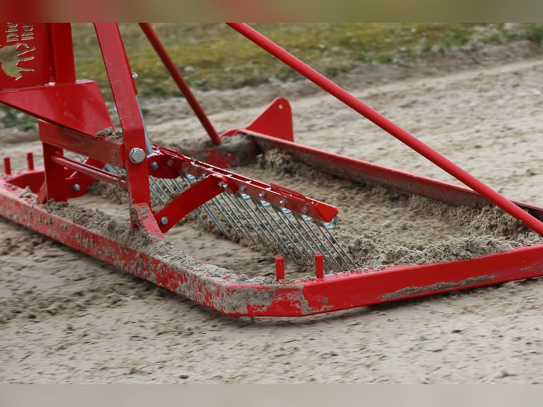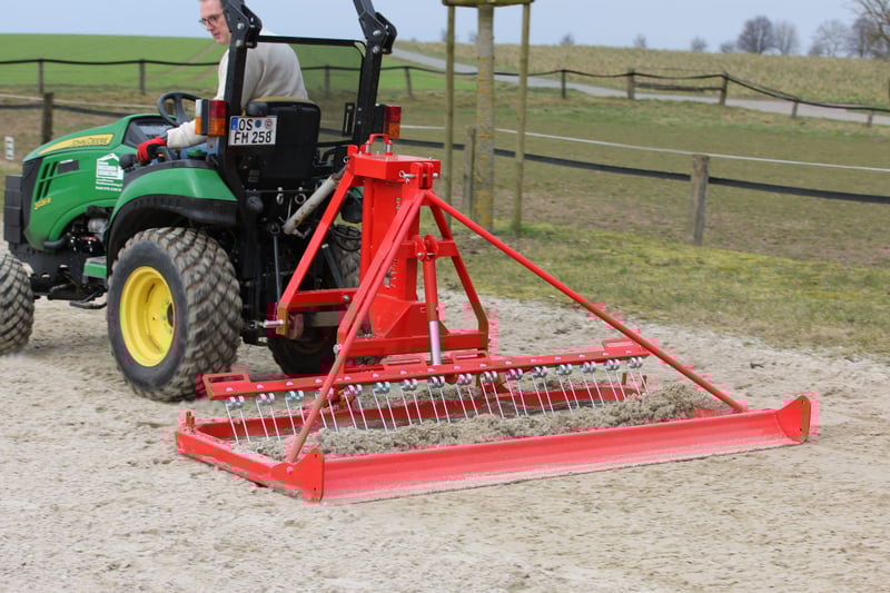 The Groomer S impresses with its customized features and proven technology. The leveling blade ensures excellent compaction, while the 80 mm steel frame guarantees high durability. Numerous additional options allow for a maintenance tool precisely tailored to your needs. No wonder it is the most popular arena grader! Our arena grader can be used on all types of riding surfaces. It helps maintain the quality of the riding surface for as long as possible. The solid 80 mm steel tube frame is extremely robust and long-lasting. The curved leveling blade provides optimal compaction of the arena surface. The thoughtfully designed edge trimmer protects arena fencing or boundary lines with its special hard rubber and cleansly trims them. Recommended for: pure sand riding surfaces (conditionally suitable for sand with additives) Features: - 80 mm steel frame - Tine - Bent leveling blade - Numerous extras available upon request - Hitch: 3-point for all common tractors