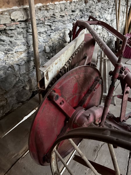 Gut erhaltene Pferdemaschine zum Schwaden. Die Maschine steht in Malans GR