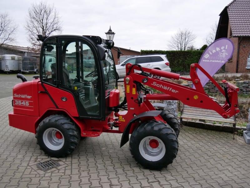 Nearly new Schäffer Model 3545 with 941 operating hours. Accessories include a pallet fork and a bucket, which can be purchased separately for an additional charge. Financing options available. Trade-ins of agricultural vehicles, construction machinery, and more are accepted.
