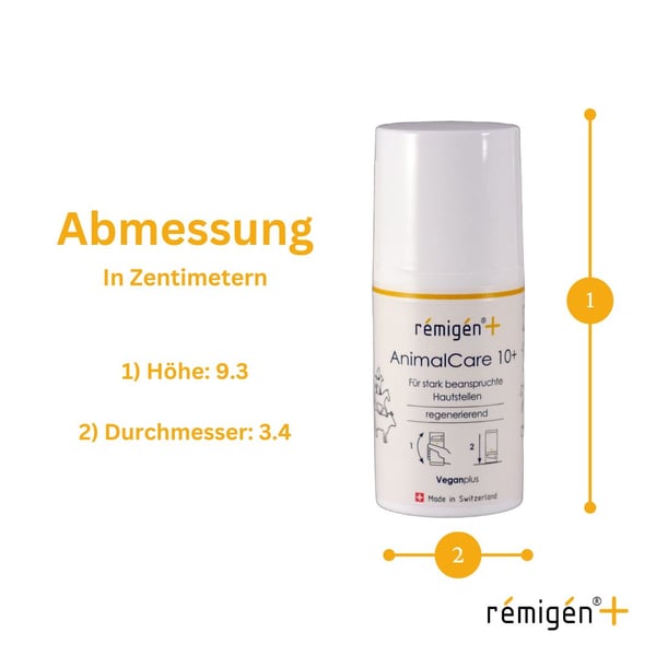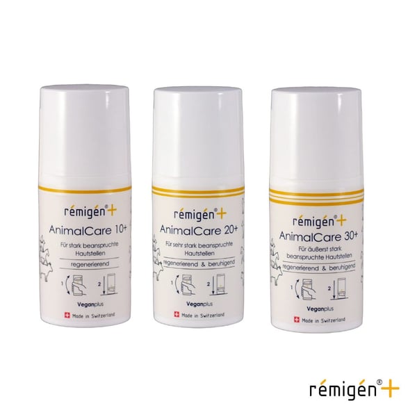· rémigén+ AnimalCare 30+: Die höchste Konzentration für sehr stark beanspruchte Haut und intensive Regenerationsbedürfnisse bei akuten Belastungen.