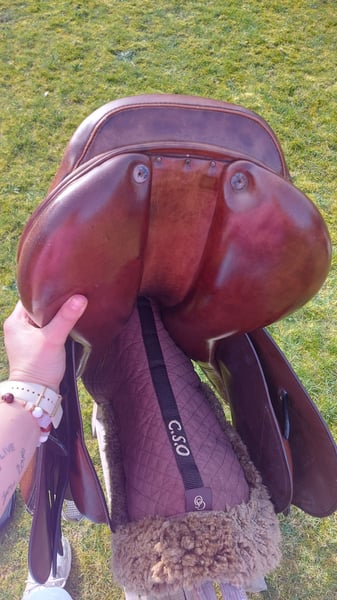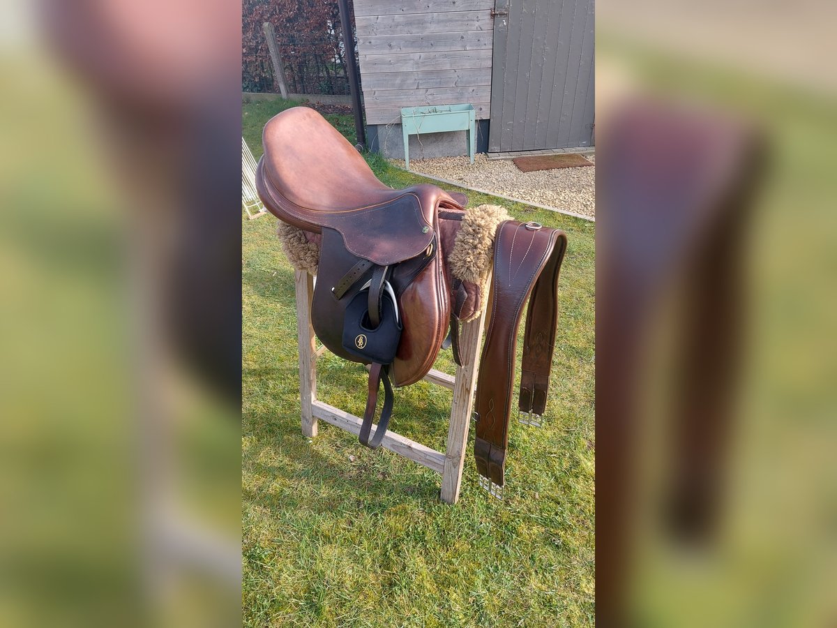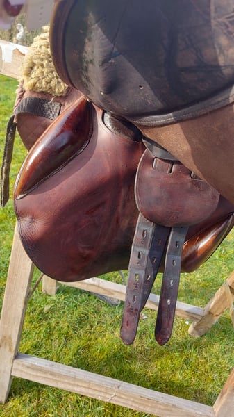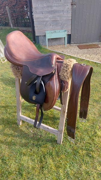 LJ Close contact springzadel Bruin leder 17,5inch Gebruikerssporen zie foto Zeer aangenaam zadel! Altijd goed onderhouden geweest 》450euro, incl stijgbeugels Stubben, springsingel LJ 140CM + CSO wolletje 》400€ (zonder singel en wolletje)