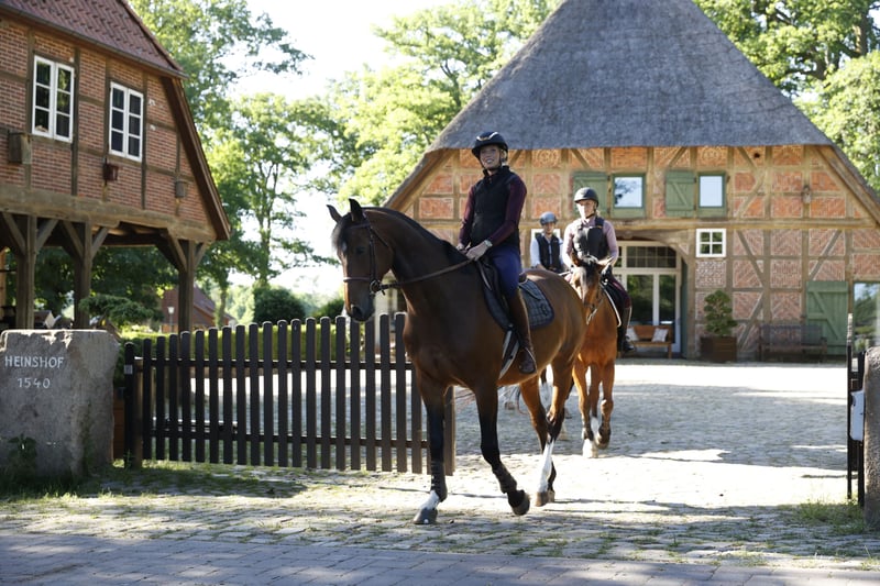 What's special about the riding stables Heinshof offers you the finest vacation apartments and sport horses to rent, lease or buy. In the middle of the nature of the Lüneburg Heath and at the gates of Hamburg - ideal for a vacation with horses, the family, the partner and to learn to ride properly. Riding vacations, riding lessons for dressage, show jumping or guided rides, farm store and much more. - Overnight stays from €43.80/night per person. Our quality horses or spacious and well-kept guest boxes are already waiting for your arrival. Your electric car can of course be parked at the farm's own charging station. 5-star riding vacation, sport horses In the equestrian region between Hamburg, Bremen and Hanover you can learn to ride, even as a late beginner, returner or adult and enjoy guided rides and vacations with horses. Your riding vacation or horse search, directly at the ride from the nature park. Vacations with or without a horse, for riders and companions. The Original Heinshof - Anno 1540 Lüneburg Heath.