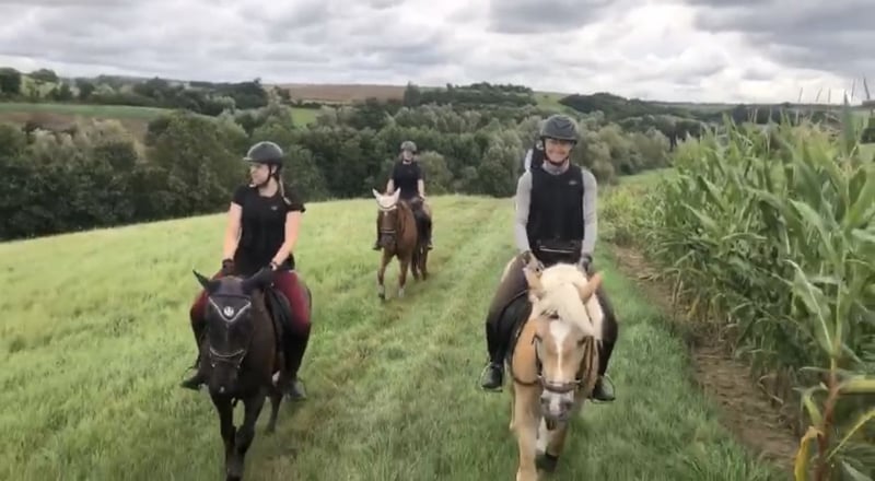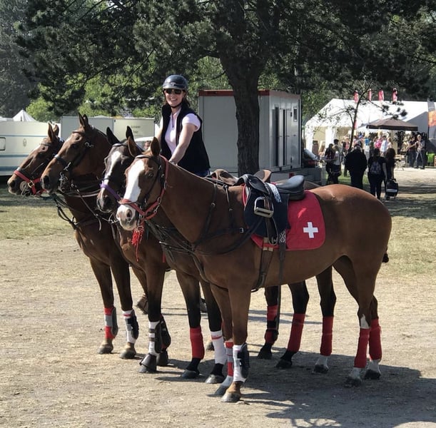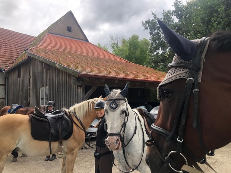 Ausbildung des jungen Pferdes – der Weg vom Züchter zum Verlasspferd: Petra Kronwitter hält beste Kontakte zu den Züchtern und ist mehrmals im Jahr in Vorort, wo sie direkt auf den Weiden die Pferde begutachtet. Diese direkte Zusammenarbeit mit den Züchtern bringt alle positiven Voraussetzungen mit, die ein zukünftiger Pferdebesitzer beim Kauf finden möchte: Drei Eckpfeiler, die ein gutes Pferd ausmachen: 1. Die Züchter kennen über viele Pferdegenerationen die Blutlinien ihrer Pferde und damit verbunden die Eigenschaften, die vererbt werden. 2. Alle Pferde wachsen in einer herrlichen, gesunden Landschaft in einer Herde mit den verschiedenen Altersgruppen auf und erhalten dadurch eine natürliche Sozialisierung. Sie bekommen viel Muskulatur und gute Lungen, wenn sie lernen, sich auf den hügeligen Weiden trittsicher zu bewegen. Wenn sie dann 3-jährig sind, fehlt den jungen Pferden allerdings eine fundierte, korrekte Ausbildung zu verlässlichen Reitpferden. 3. Die übernimmt Petra Kronwitter dann, wenn sie sich vom freundlichen und positiven Charakter der Pferde überzeugt hat. Sie wählt einige aus und holt sie zu sich in ihren Stall in Mainbernheim, wo sie in den nächsten Monaten ausgebildet werden. Petra hat meist schon Anfragen von Kunden und sucht sich die Pferde aus, von denen sie überzeugt ist, dass sie zu den Familien oder Turnierreitern gut passen könnten. So gibt es die sportlichen, die sensibel und leistungsbereit unter dem Reiter sind, genügend Potential in den die Grundgangarten haben, sich geschickt beim Springen anstellen oder mutig im Gelände über Gräben und feste Sprünge gehen. Trotz dieser wunderbaren Rittigkeit sind sie immer klar im Kopf. Diese sensiblen Pferde verlangen nach einem feinfühligen, aber mutigen Reiter, um im Leistungssport oder auf der Jagd ihr Können zu zeigen. Oder es gibt die gutmütigen, gelassenen und braven Pferde, die nach korrekter Ausbildung als Familien- und Freizeitpferd den zukünftigen Besitzern viel Freude machen und den eher vorsichtigen Reitern viel Vertrauen geben. Wenn die Pferde dann entsprechend ausgebildet sind, werden sie oft von Junioren der Reitschule auf Turnieren vorgestellt oder gehen bei Reitjagden mit, so dass die Interessenten wissen, dass das Pferd im Sport erprobt ist, sich verladen lässt und durch seinen guten Charakter ruhig, aber leistungsbereit alles mitmacht.