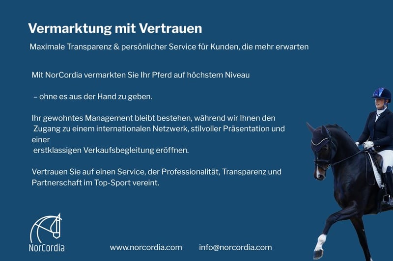 Vermarktung mit Vertrauen Was wir bieten: o Rundum-Full-Service von der ersten Anfrage bis über den Verkauf hinaus o Transparente Prozesse für maximale Sicherheit und Vertrauen o Hochwertige Medienproduktion (add ons) o Globale Käuferreichweite durch eine internationale Datenbank o Strategisches Multichannel-Marketing über Websites, SoMe & Kontaktlisten o Komplette Koordination mit dem Kunden o Begleitung der Ankaufsuntersuchung bis hin zum Vertragsabschluss o Beratung nach dem Verkauf (Verbringung in den neuen Stall/ add ons) Wir beraten Sie gern. Sprechen Sie uns an! Darüber hinaus können wir Ihnen stets 1-2 Berittplätze für die Vermarktung von exclusiven Dressurpferden anbieten, wenn Sie Ihr Pferd zum Verkauf bestmöglich gemanagt und präsentiert wissen möchten. _____________________________________________________________ Möchten Sie mehr erfahren? Kontaktieren Sie das NorCordia-Team English: Ulrik Clemmensen: +45 2441 5012 Deutsch: Yvonne Fiestelmann: +49 173 2525987 E-Mail: info@norcordia.com HORSES FOR LIFE! WWW.NORCORDIA.COM
