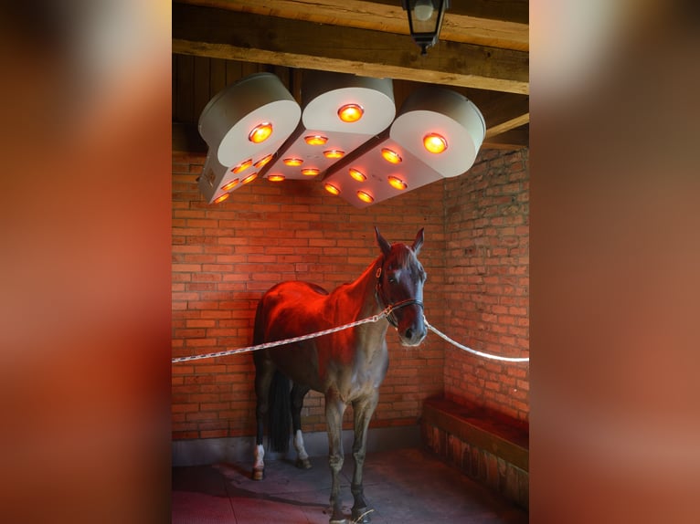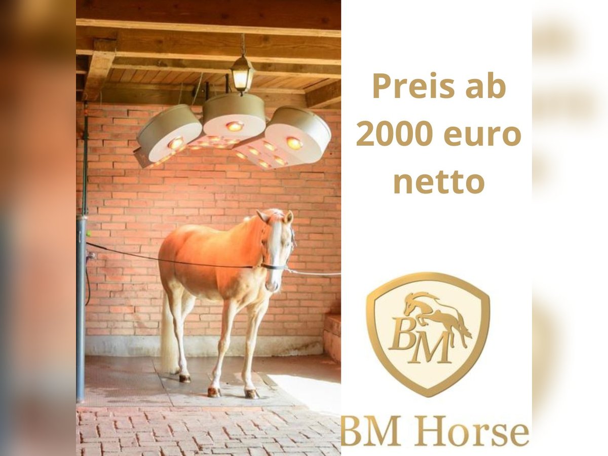Pferdesolarien sind in vielen Ställen zu einem unverzichtbaren Ausrüstungsgegenstand geworden, nicht nur wegen der Möglichkeit, Pferde nach anstrengendem Training zu trocknen, sondern vor allem wegen ihrer therapeutischen Eigenschaften. BM Horse Solarien beschleunigen den Abbau von Milchsäure in den Muskeln und erwärmen sie, was die Durchblutung im Körper des Pferdes fördert. Dies führt zu einer schnelleren Entspannung der Muskeln und einer schnelleren Rückkehr zum optimalen Muskeltonus. Diese Vorteile führen zu einer schnelleren Regeneration des Muskel- und Skelettsystems nach dem Training und einer Reduktion von Schmerzen, insbesondere im Bereich der Kruppe, des Rückens, des Widerristes, des Halses und des Genicks. Interessant zu wissen: BM Horse Solarien sind auch für Menschen vorteilhaft, da Lichttherapie nachweislich ähnliche Vorteile hat wie bei Pferden! BM Horse Stallprodukte werden mindestens sechs Monate lang im BM Horse Reitsportzentrum in Tągowie getestet, bevor sie auf den Markt kommen. Seit über 10 Jahren verwenden wir ausschließlich unsere eigenen Produkte, was uns ermöglicht, kontinuierlich Verbesserungen vorzunehmen, um Ihnen höchste Qualitätsstandards zu bieten. Die roten Lampen im SOLAR TECH stimulieren die Durchblutung, verbessern das Wohlbefinden der Pferde, lindern Stress und Spannungen und unterstützen die Lüfter beim Trocknen. Mit SOLAR TECH können Sie zwischen einem manuellen Bedienfeld oder einer Touch-Version (auch mit Münz- oder Jeton-Einwurf verfügbar) wählen. Die Wahl der Bedienfelder ist obligatorisch, wenn Sie sich für das Solarium mit elektrischen Hubsystemen zum Absenken entscheiden; ohne das Bedienfeld können sie nicht betrieben werden. Die Bedienfelder regeln auch die Betriebszeit des Solariums und schalten es nach der eingestellten Zeit automatisch ab. Ohne diese muss das Gerät jedes Mal manuell vom Stromnetz getrennt werden. BM Horse Stallprodukte werden mindestens sechs Monate lang im BM Horse Reitsportzentrum in Tągów getestet, bevor sie auf den Markt kommen. Seit über 10 Jahren verwenden wir ausschließlich unsere eigenen Produkte, was uns ermöglicht, kontinuierlich Verbesserungen vorzunehmen, um Ihnen höchste Qualitätsstandards zu bieten. Wie verwendet man das BM Horse Solarium richtig? SOMMER: Im Sommer wird das Solarium seltener benutzt, eignet sich jedoch hervorragend zum Trocknen des Pferdes nach dem Training bei schlechtem Wetter. Wir empfehlen auch die Nutzung der Lichttherapie nach dem Training an kühleren Tagen oder im Rahmen der Physiotherapie, wenn die Pferde Muskelverspannungen oder -schmerzen haben. KÜHLERE MONATE: Wir empfehlen, das Solarium vor dem Training zu nutzen, um die Muskeln richtig aufzuwärmen und das Pferd bei der Lösungsphase zu unterstützen. Diese präventive Maßnahme reduziert das Verletzungsrisiko erheblich. Nach dem Training wird das Solarium zum Trocknen und zur Muskelregeneration genutzt. Sobald das Pferd trocken ist, kann es sicher eingedeckt und in die Box oder auf die Koppel gebracht werden. SOLAR TECH Spezifikationen Zusätzliche Ausstattung: Elektronische Steuerung (auch mit Münz- oder Jeton-Einwurf verfügbar) Höhenverstellung durch teleskopische elektrische Hebesysteme* (300mm bei niedrigen Decken, 600mm bei hohen Decken) Bodenmontierter Rahmen zur Aufhängung des Solariums *Die Montage von Solarien ohne Servomotor ist möglich, jedoch ist ohne sie keine Höhenverstellung in Bezug auf das Pferd möglich. Elektrische Spezifikationen: Leistungsanforderung: 3,2 kW Versorgungsspannung: 230 V Stromverbrauch: 15A Erforderlicher Schutz: 20A Preis netto für 1 Panell