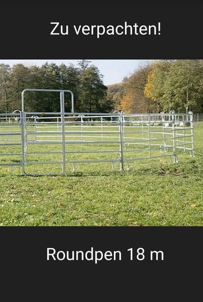 Wir bieten einen ROUNDPEN vom Qualitätshersteller PATURA, Modell Compact, langfristig zur Pacht an. Mindestlaufzeit 12 Monate, spätere Übernahme mit Teilgutschrift aus den Pachtzahlungen möglich. Die Standardausführung besteht aus einem 18-teiligen Set / davon 17 x 3,00 m plus 1 x 3,00 m inklusive Tor. Ergibt einen möglichen Durchmesser von 17,20 m. Paneelhöhe 170 cm, Paneelelement mit Tor Höhe 2,20 m. Zusatzelemente jederzeit möglich. Lieferung erfolgt werksseitig durch PATURA direkt zu Ihnen. Monatlicher Pachtpreis mit Teilgutschrift bei späterer Übernahme. Anfragen gerne telefonisch an 0172 - 839 66 50 / Rainer Lechl.