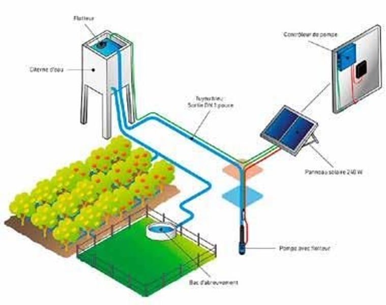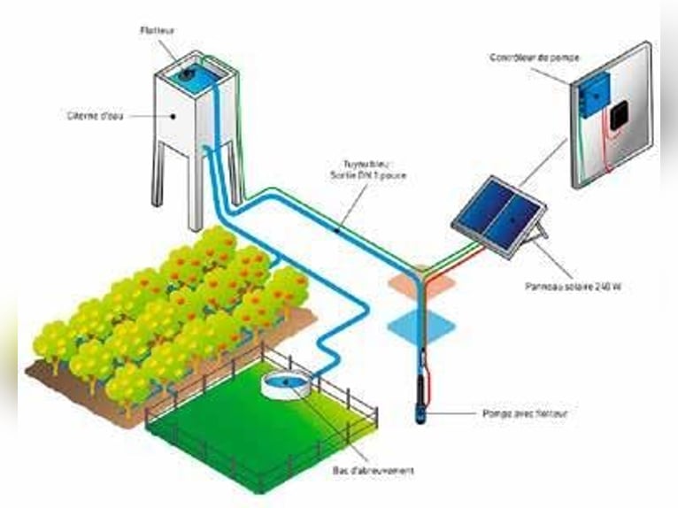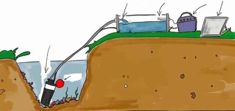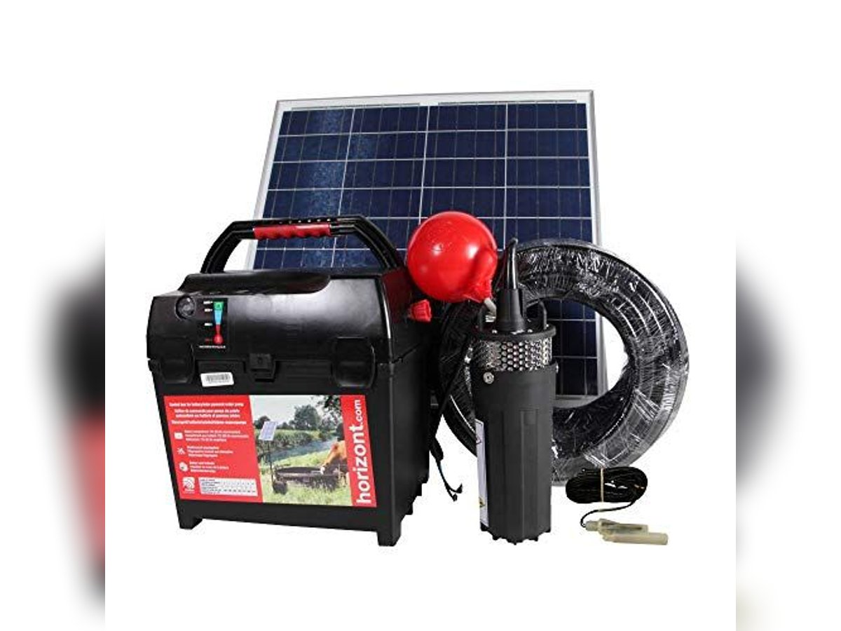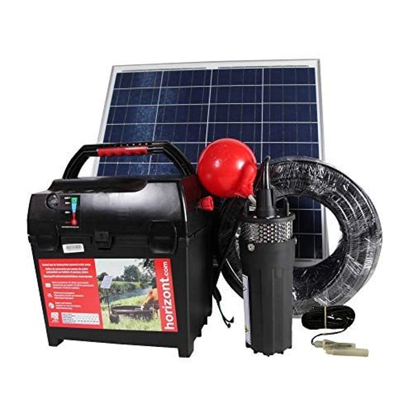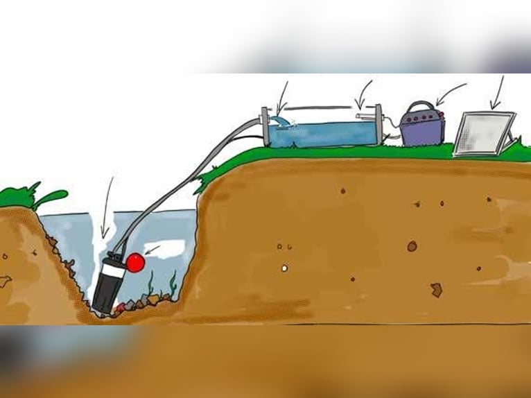 Pompa dell'acqua alimentata a batteria, con possibilità di upgrade con pannello solare • Soluzione semplice, affidabile e autonoma per l’approvvigionamento idrico degli animali da pascolo presso corsi d’acqua recintati • Il set di pompe può essere utilizzato con tutte le ciotole d’acqua standard • Custodia portabatterie impermeabile in polipropilene per batterie al piombo da 12 V con capacità fino a 75 Ah • Unità di controllo con indicatore di tensione della batteria • Pannello solare monocristallino da 30 W con cavi di collegamento da 5 m, opzionale • Supporto stabile verniciato a polvere, alto 1,65 m • Tubo da 30 m, 3/4" con pompa sommergibile • Valvola a galleggiante con cavo di collegamento da 5 m • Batteria al piombo da 12 V, circa 75 Ah, inclusa