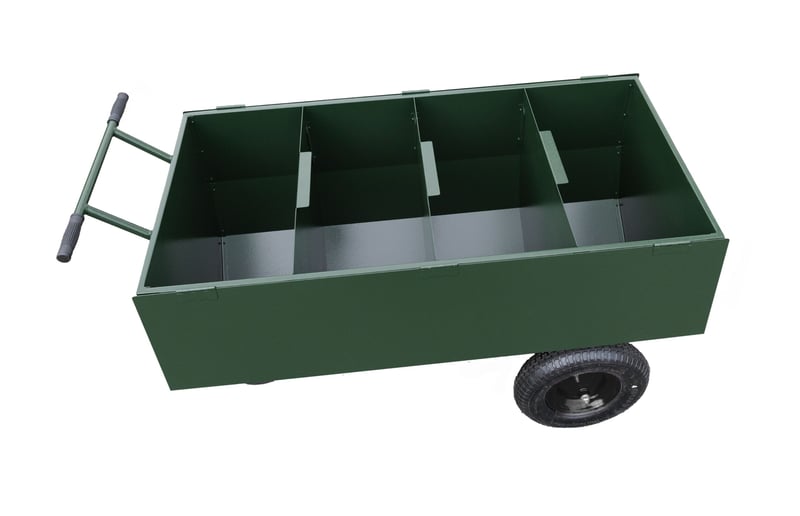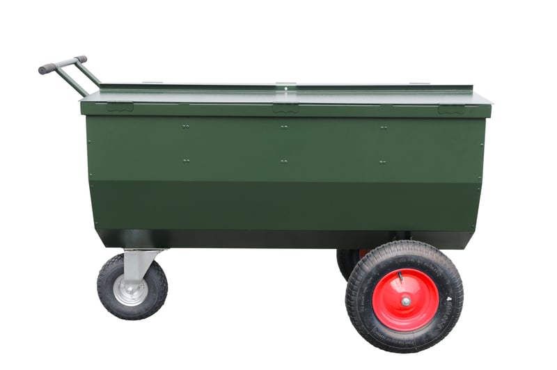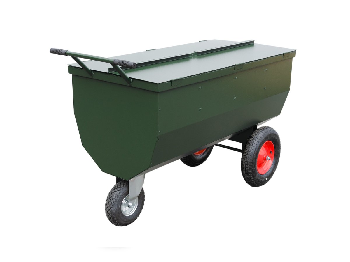 Leicht fahrbarer Futterwagen mit verschließbarem Deckel. Dank der größen Luftgummireifen und der Lenkrolle ist unserer Futterwagen sehr leicht durch die Stallgassen zu schieben. Beschreibung: - 3 Trennwände, für Aufbewahrung von bis zu 4 Futtersorten - neue, größere Räder – für einfache Nutzung - der 2-teilige Deckel mit einem Schloss verschließbar - Standard Farbe: grau