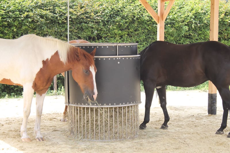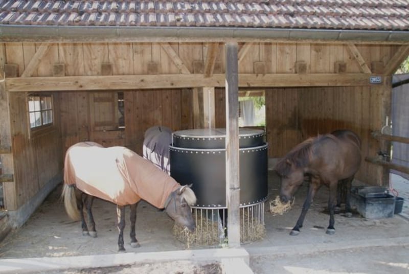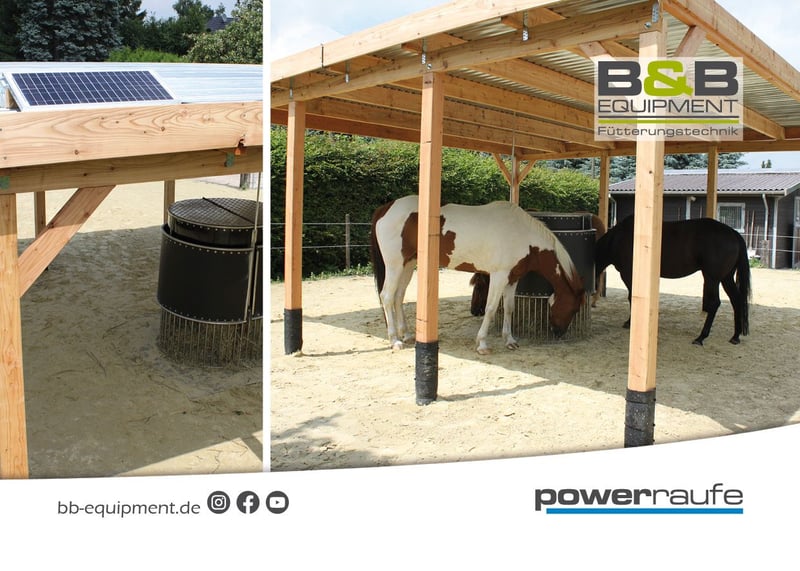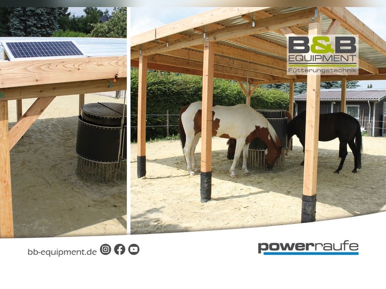 Nourrir les chevaux en fonction du temps ! Le Powerraufe en acier inoxydable vous permet de distribuer à vos chevaux en stabulation libre ou en boxes de petites rations de foin tout au long de la journée. Vous avez la possibilité de remplir le Powerraufe avec 12 à 15 kg de foin aéré (par râtelier semi-circulaire) et de le rationner très facilement en réglant les heures d'ingestion. Vous pouvez contrôler vous-même quand et combien de temps les chevaux ont accès au foin. Avec jusqu'à 20 intervalles d'alimentation possibles, le Powerraufe est le garant contre l'ennui et le comportement alimentaire incontrôlé. Le Powerraufe est disponible en option avec un système d'humidification du foin intégré. Vous pouvez ainsi prévenir efficacement la poussière de foin et la toux du cheval en fonction du temps. Avec le Powerraufe H²O (y compris l'arrosage du foin), vous pouvez arroser et dépoussiérer le foin frais à chaque alimentation. La réserve de foin qui se trouve dans la partie supérieure du Powerraufe reste sèche et intacte ! Le Powerraufe est le partenaire idéal dans la lutte contre la BCO, la toux du cheval et les allergies au foin. Les Powerraufe, qu'ils soient ronds ou ½ ronds, sont livrés entièrement montés et prêts à l'emploi sur une europalette. Le Powerraufe est adapté à l'extérieur et peut être utilisé de différentes manières. Si vous avez des questions, n'hésitez pas à nous envoyer un message en indiquant votre adresse e-mail ou à nous appeler, nous sommes à votre entière disposition. Fabriqué en Allemagne www.bb-equipment.de