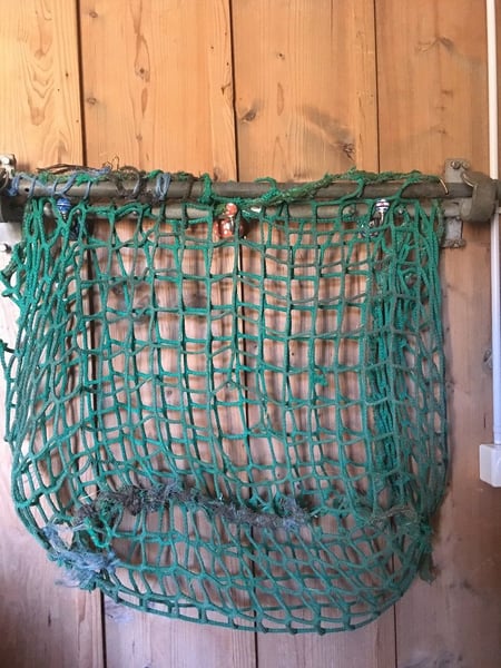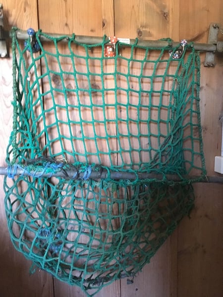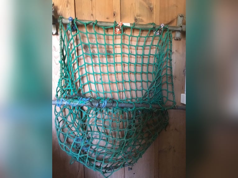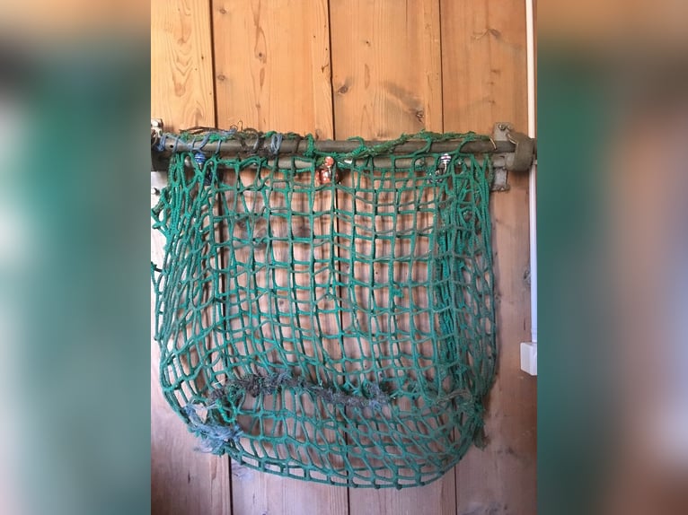 Aufhängung aus Eisen, einfach und schnell befüllbar mittels Aus- und Einklinken der vorderen Haltestange, einige Netzmaschen um ausklinkbare Stange repariert, NP Euro 200.-
