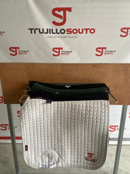 Colgador Mantillas ideal para colgar mantillas (también protectores o vendas) sus dos posiciones, nos permite que queden separadas para facilitar el secado del sudor o después de lavarlas, o plegadas lo que hace que ocupe el mínimo espacio, al ser un producto de acero inoxidable el sudor, agua, arena… no produce corrosión. Fabricado 100% en Acero Inoxidable calidad AISI 304, y soldado a TIG aportando varilla de acero inoxidable calidad AISI 316.