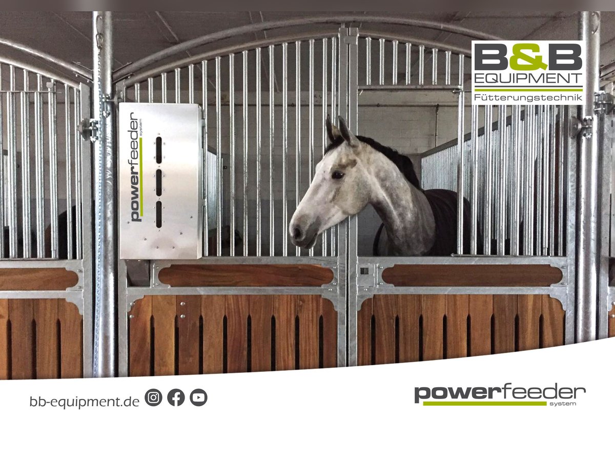 Guten Tag, Das powerfeeder-System ist der automatische zeitgesteuerte Kraftfutterautomat vom Fohlen- bis Seniorfutter. Für mehr Gesundheit und Wohlbefinden für Ihr Pferd. Für Sie mehr Zeit mit Ihrem Pferd. 24/7 wird Ihr Pferd mit unserem powerfeeder-System versorgt. Das powerfeeder-System verfügt über unterschiedliche Modelle und kann von Pellet, Hafer, Gerste bis hin zum Seniorfutter mit viel Struktur und Melasse. Durch viele kleine gesunde Portionen wird Ihr Pferd das Kraftfutter besser verwerten können, zudem ist es magenschonender. Der powerfeeder ist aus Edelstahl und 100% nachrieselfrei und lässt sich spielend leicht programmieren. Betrieben werden kann der powerfeeder im Netzstrom, Akku oder AkkuSolar. Gerne sind wir Ihr Ansprechpartner für die zeitgesteuerte Fütterung Ihrer Pferde. Auch für Sonderanfertigungen, mit denen Spezialfutter wie Luzerne, faserige Futtersorten oder pulverartige Mineralfuttersorten zugeteilt werden sollen, haben wir die passende Lösung und eigens entwickelte Spezialfuttersysteme parat. In unserem Sortiment haben wir verschiedene Kraftfutterautomaten für verschiedene Futtersorten sowie die Option mit Bewässerung. Sprechen Sie uns an! Für Beratung und alle Fragen rund um unsere Futterautomaten und den zu realisierenden Möglichkeiten stehen wir Ihnen natürlich jederzeit gerne zur Verfügung. Wir freuen uns auf Ihre Nachrichten! B&B equipment GmbH Made in Germany