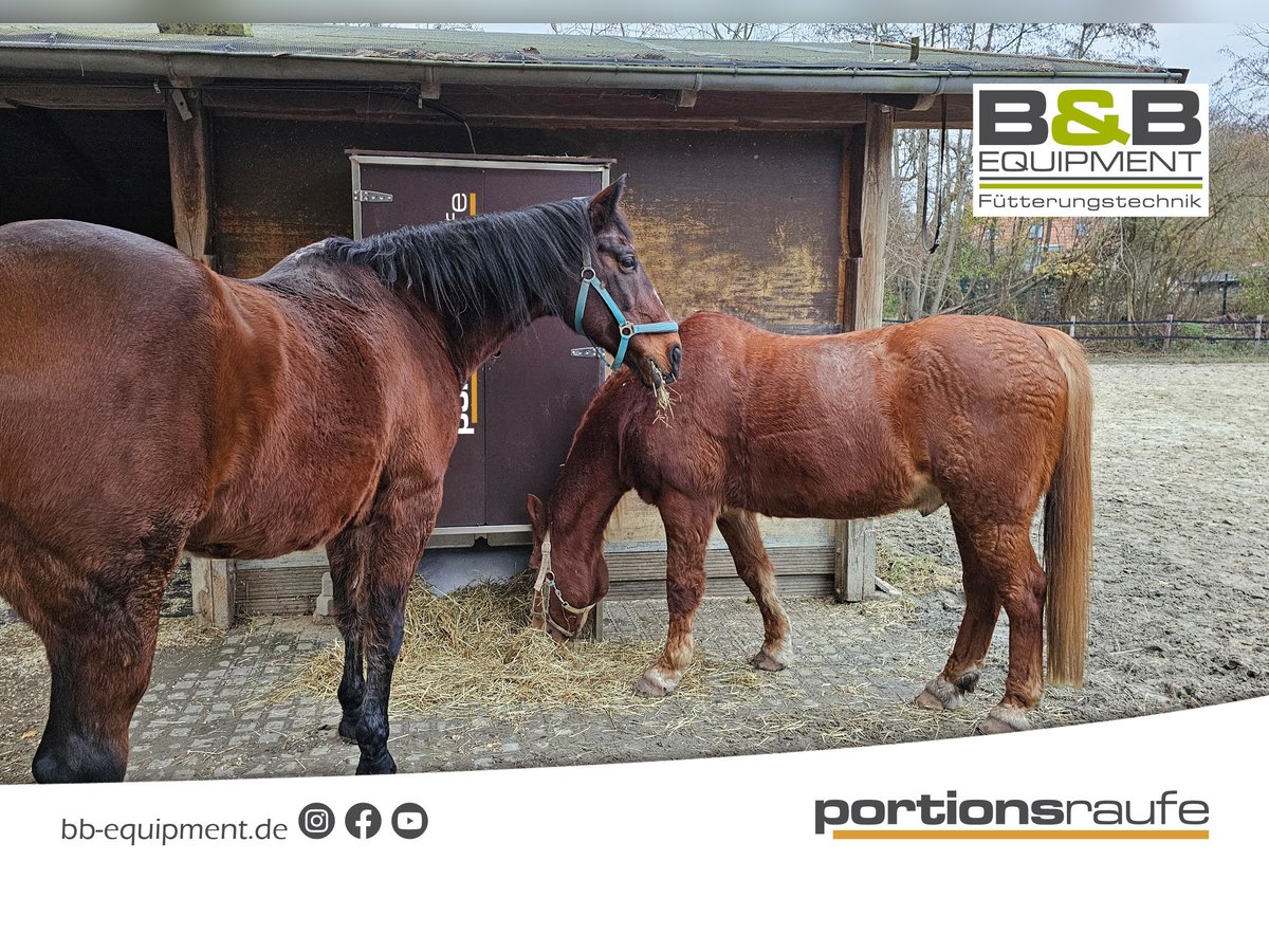 Guten Tag, der zeitgesteuerte automatischer Heuschrank für 4 Portionen zu. Mit der portionsraufe wird Ihr Pferd 24/7 optimal versorgt. Je nach Modell fasst die portionsraufe 6 - 8kg oder 10 - 12kg aufgelockertes Heu. Die Fütterungszeiten lassen sich kinderleicht einstellen. Die portionsraufe kann in der Box oder im Außenbereich stehen. An einer portionsraufe haben 2 oder 3 Pferde/Pony Platz, um in Ruhe ihr Heu zu fressen. Das Heu wird auf 4 Lagen verteilt und wird zu eingestellter Zeit freigegeben. Natürlich lassen sich auch andere Futtermittel wie z.B. Äpfel und Möhren füttern. Wir sind Ihr Partner für die zeitgesteuerte automatisierte Fütterung ihrer Tiere, ob Kraftfutter oder Raufutter. Wir freuen uns auf Ihre Nachrichten! B&B equipment GmbH Made in Germany