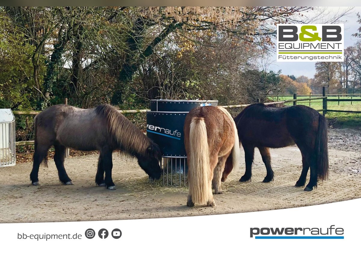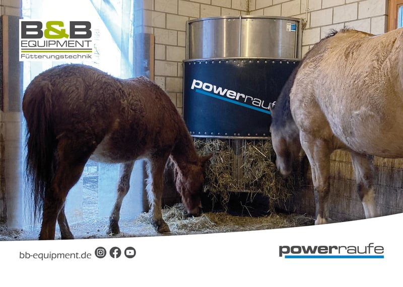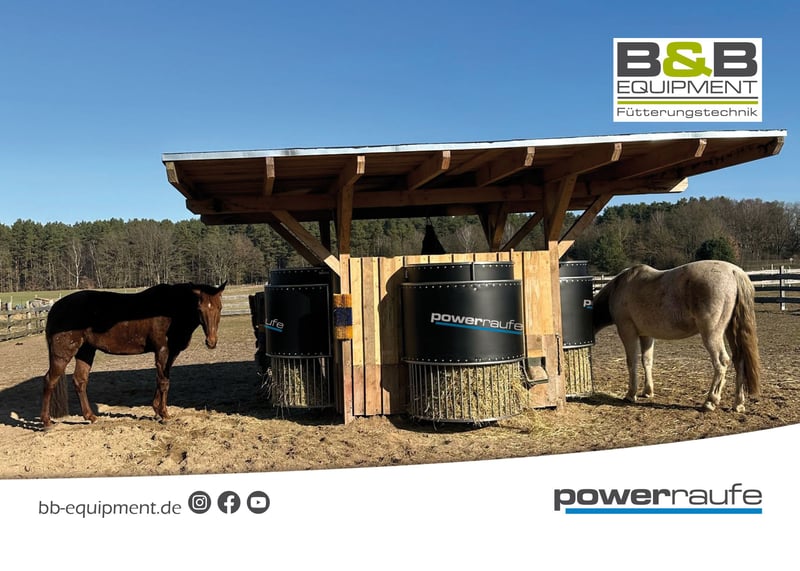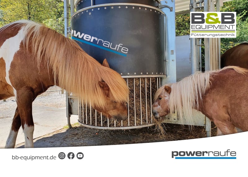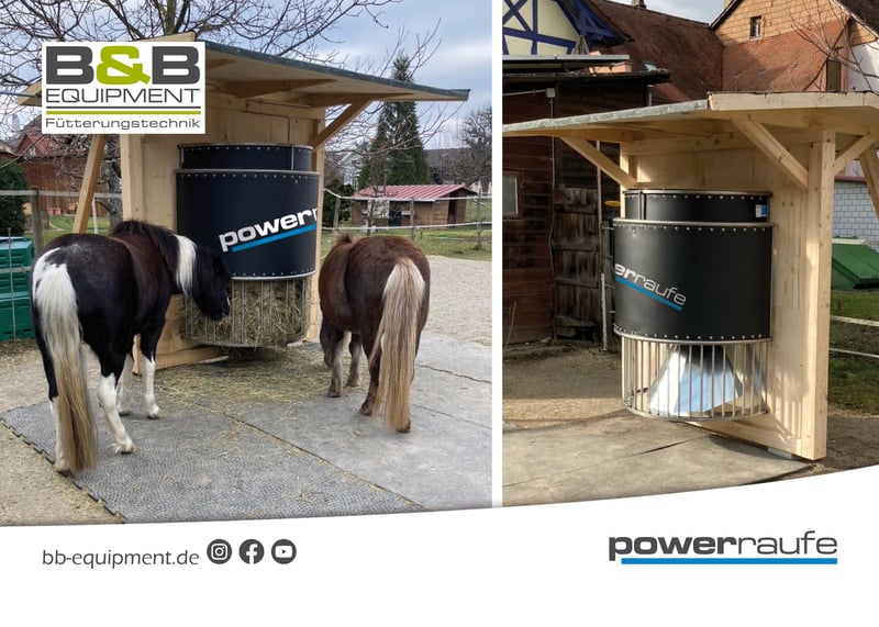Guten Tag, wir bieten die zeitgesteuerte automatische Heuraufe aus Edelstahl an. Mit der powerraufe können Sie Ihr Pferd 24/7 zeitgesteuert automatisch füttern, ohne dabei in Stress zu geraten. Mit der powerraufe in ½ halbrund oder rund ist das gar kein Problem. Die powerraufe aus Edelstahl ermöglicht es Ihnen, ihr Pferd in der Offenstall- oder in der Boxenhaltung über 24/7 verteilt mit kleinen gesunden Heurationen zu versorgen. Die Zeiten legen Sie selber spielend leicht per Tasten oder via App im Bluetooth Bereich fest. Sie selbst bestimmen wie lange Ihre Pferde Zugang zum Heu haben. Die powerraufe, die Heuraufe zeitgesteuerte Heuraufe hat ein Fassungsvermögen je (½ halbrund) von 12-15kg aufgelockerten Heu. Zudem kann die Heuraufe optional mit einer eingebauten Heubefeuchtung ausgestattet werden. So können Sie zeitgesteuert und effektiv gegen Heustaub und Pferdehusten vorbeugen. Betrieben werden kann die powerraufe im Netzbetrieb oder im AkkuSolar Betrieb. Unsere Raufen sind absolut wetterfest und können ruhig im Außenbereich stehen. Die powerraufen, die Heuraufe werden ganz gleich ob Rundraufe oder ½ Rundraufe, komplett montiert und bereits einsatzbereit auf einer Europalette zu Ihnen geliefert. Bei Fragen senden Sie uns gerne eine Nachricht oder rufen Sie uns an, wir stehen Ihnen gerne jederzeit zur Verfügung. B&B equipment GmbH Made in Germany