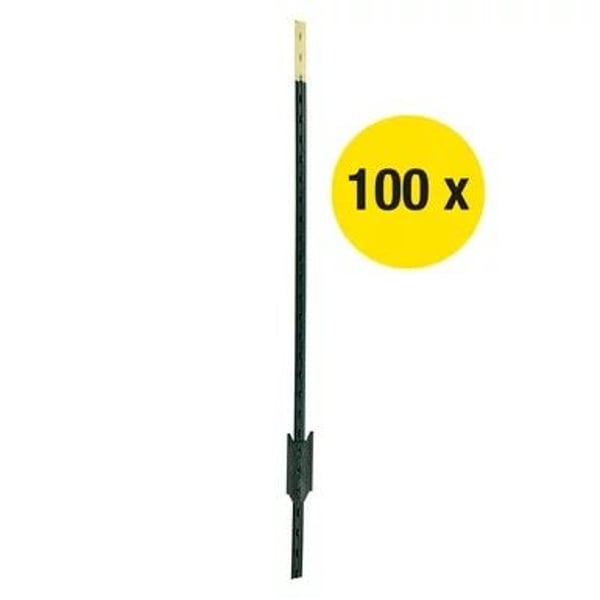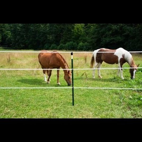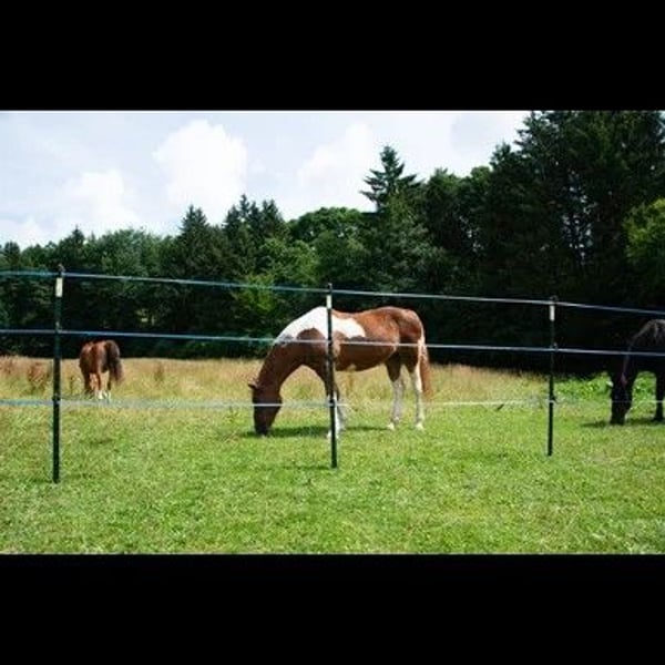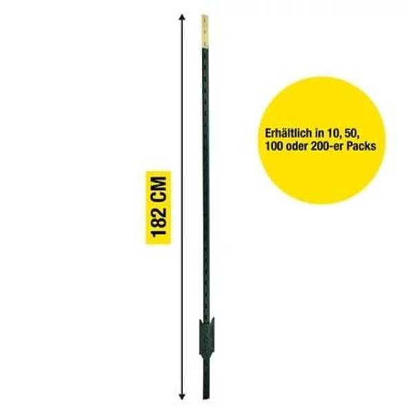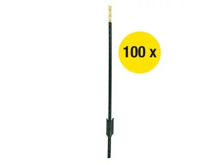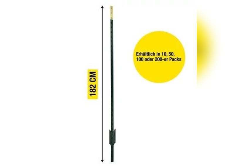 T-Pfosten ECO │ Metallpfahl│ grün │1,80 m hoch, 100 stück Für Festzäune, Elektrozäune und zur Wildabwehr Sehr robuste Pfähle aus recycelten Stahl (Güteklasse ST42), langlebig und belastbar Für Litze, 6 mm Seil, Draht und 50 mm Breitband Guter Halt in weichen Böden dank Ankerplatte mit drei "Noppen" Beim Zaunbau kommt besonders den Pfählen eine hohe Bedeutung zu. Mit Ihnen steht und fällt der Zaun im wahrsten Sinne des Wortes. Nicht umsonst kommt den Eck- und Torpfosten im Zaunbau eine hohe Bedeutung zu. Diese haben einen großen Durchmesser und werden tief in den Boden eingebracht. Diese Pfähle nehmend die Zugkräfte auf, mit denen das Leitermaterial gespannt wird, aber auch die vielfachen Kräfte dessen durch Winddruck und Gewichtserhöhungen durch Regen oder Schnee. Zudem wird die Standfestigkeit der Streckenpfosten, die zwischen den Eck- und Torpfosten eingebracht werden, besonders durch regenreiche Zeiten negativ beeinträchtigt. Die Standfestigkeit der Pfähle mit besonders kurzen Bodennägeln und einem geringen Durchmesser wird im durch Regen aufgeweichtem Boden herab gesetzt. Der T-Post bietet eine super Lösung an, die zwischen den beiden obigen Extremen anzusiedeln ist. Die aus dickem Stahl gefertigten Pfähle sind sicher schwerer als Kunststoffpfähle, aber handlicher als große Pfosten aus Holz. Anwendungsbeispiele und Besonderheiten für Festzäune, Elektrozäune und zur Wildabwehr sehr robuste Pfähle aus recyclebaren Material, langlebig und belastbar geeignet für Litze, 6 mm Seil, Draht und 50 mm Breitband guter Halt in weichen Böden dank Ankerplatte mit drei "Noppen" Beschreibung Die T-Pfosten ECO zeichnen sich durch ihre Stabilität und Langlebigkeit aus und sind eine top Alternative zu Holzpfählen. Die 1,80 m hohen Pfosten sind aus Recyclingstahl der Güteklasse ST42 gefertigt und lackiert. Dabei erstreckt sich die Ankerplatte über drei „Noppen“, so hat der Pfosten auch in weichen Böden einen guten Halt. An dem T-Profil können die unterschiedlichsten Isolatoren für die Aufnahme des gewünschten Leitermaterials befestigt werden. Folgendermaßen eignet sich der Pfosten für Draht, 6 mm Seil, Litze und 50 mm Breitband. Außerdem sind die T-Pfosten sehr flexibel und können als Eck-, Strecken-, Tor-, Anfangs- und Endpfahl eingesetzt werden. Nachdem man den Pfosten ideal in den Boden eingeschlagen hat, hat der Zaun eine Höhe von 1,46 m und eignet sich perfekt zum Einzäunen von Vieh und zur Abwehr von Wildtieren. Alles in allem überzeugen die T-Pfosten ECO und geben Ihrem Weidezaun Stabilität. Dank der Vielseitigkeit können Sie alle Weidezaunmaterialien an dem Pfahl befestigen und nach Ihren Wünschen den Zaun aufbauen. Die T-Pfosten ECO sind die idealen Weidezaunpfähle für Ihre Weide. Lieferumfang: T-Pfosten ECO │ Metallpfahl│ grün │1,80 m hoch, 100 stück Zusätzliche Produktinformationen Höhe 180 cm