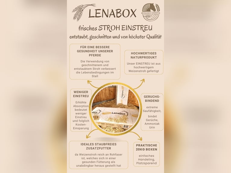Schönen guten Tag liebe Stallbetreiber, Züchter und Pferdebesitzer wir suchen alle immer wieder die Nadel im Heuhaufen bezüglich der passenden Einstreu für unsere Pferde. Dabei steht die Qualität an erster Stelle. Die Pferde sollten sich oft und gerne in der Einstreu ablegen, damit sie wirklich ausgeruht sind und eine gute Leistung erbringen können. Das Handeling sollte möglichst einfach und schnell von statten gehen, sowohl beim Einstreuen als auch beim Ausmisten, und es sollte geruchbindend und in jedem Fall saugstark sein. Gerade in der heutigen Zeit, wo immer mehr Pferde an Asthma leiden und der Anspruch an staubloses Einstreumaterial stetig steigt, wird es immer wichtiger, auf qualitativ hochwertige Einstreu zu setzen, die im Idealfall entstaubt ist. Das Mistvolumen sollte sich ebenfalls in Grenzen halten und zusätzlich soll es sich für eine gute Bodenbearbeitung beim Ausbringen auf den Weiden eignen und diese nicht unnötig übersäuern. All diese Punkte erfüllt unser Produkt LENABOX Hochwertiges Naturprodukt aus mehrfach entstaubtem Weizenstroh, wodurch es Allergikergeeignet ist. Praktisches Handeling durch 20kg Ballen. Ca. 400x saugfähiger als herkömmliches Stroh Hochwertiges, staubfreies Zusatzfutter, da Weizenstroh reich an Rohfaser ist, welches sich in einer gesunden Fütterung als unabdingbar heraus stellt. - durch die gehäxelte Verarbeitung zersetzt es sich schneller als andere Einstreuarten - Kostenersparnis durch sehr gute Saugkraft Falls wir euren Betrieb neugierig gemacht haben, wir schicken Ihnen ein Angebot zu.... LKW Abnahme ( 33 Paletten - 27 Ballen pro Palette). Kleinere Abnahmen eventuell möglich. Selbstabholung natürlich ebenfalls möglich. Mehr Infos gerne per PN oder WhatsApp 00386 68 129 392 Freu mich auf unsere Zusammenarbeit Angelika Pristov STRAWBOX COMPANY *** im EINKLANG mit PFERD und NATUR *** www.lenabox.si/de Wir beliefern Privatställe, Händler sowie auch Grossabnehmer
