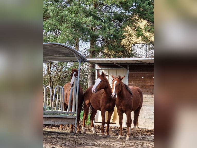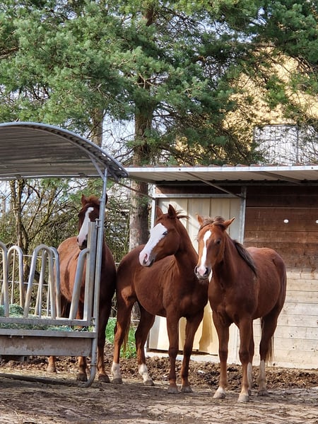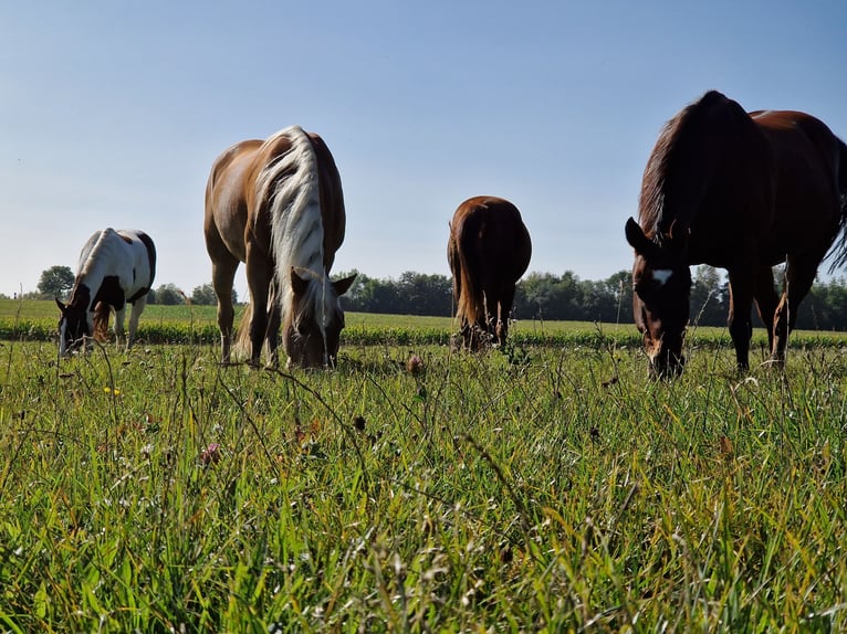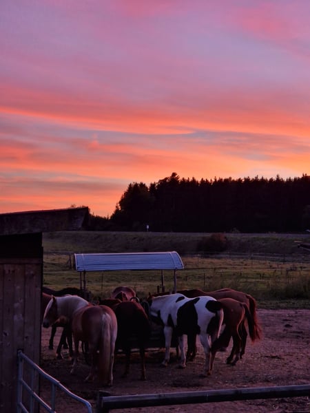 Spacious open stable with large paddocks, loving mixed herd with young mares and geldings. For ponies and horses up to a maximum height of 1.54 m Indoor use possible for an extra charge ✅️ Grooming area in the dry area ✅️ Toilets ✅️ Parking lot ✅️ Beautiful riding area