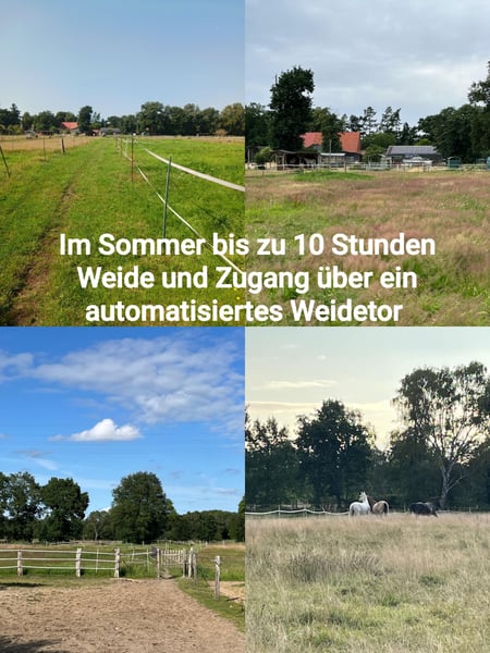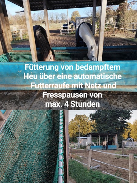 Hallo liebe Besitzer*innen von Wallachen mit und ohne Atemwegsproblemen, in unserem privaten Offenstall ist ein Platz für ein freundliches Hafermoped bis 1,60 m frei. Wir stehen auf einem Hof mit 13 autarken Offenstallkonzepten. Unsere Gruppe besteht aus maximal 4 Wallachen. Derzeit stehen da zwei spanische Jungs (11 und 23 J.), die sich über spielfreudigen Herdenzuwachs freuen würden. ***Fütterung*** Wir füttern bedampftes Heu (ca. 10 kg pro Pferd) aus einer automatischen Heuraufe mit Netz. Wasser gibt es aus einer frostsicheren Selbsttränke. Winter: Fresszeiten von insgesamt ca. 10 - 12 Stunden über Tag/Nacht verteilt mit max. 4 Stunden Pause. Sommer: bis zu 10 Stunden Weide tagsüber und nachts ~5 kg Heu pro Pferd. Sie gehen über ein automatisches Weidetor raus und haben jederzeit Zugang zum Paddock und Unterstand. ***Mitarbeit*** Wir sind ein Selbstversorgerstall, d.h. wir müssen Reparaturen und andere anfallende Arbeiten selbst erledigen. Der Unkostenbeitrag umfasst Platz, Heu (10 bzw. 5 kg) und Instandhaltung. Bei 4 Pferden fallen 2 Stalldienste pro Woche an, d.h. Paddock/Weide absammeln, Heu vorbereiten, fegen. Wir haben kurze Wege, das Heu muss nicht weit getragen werden. Der Stalldienst kann eventuell abgetreten werden. ***Ausstattung*** - beleuchteter Reitplatz - Bodenarbeitsplatz - Longierzirkel, - Strom, Licht, WC - Hunde können mitgebracht werden - keine Stall-Öffnungszeiten - eigene*r Reitlehrer*in kann mitgebracht werden - den wunderschönen Klövensteen erreicht man in 15 Minuten Falls es dich anspricht und es zu den Bedürfnissen deines Pferdes passt, melde dich!