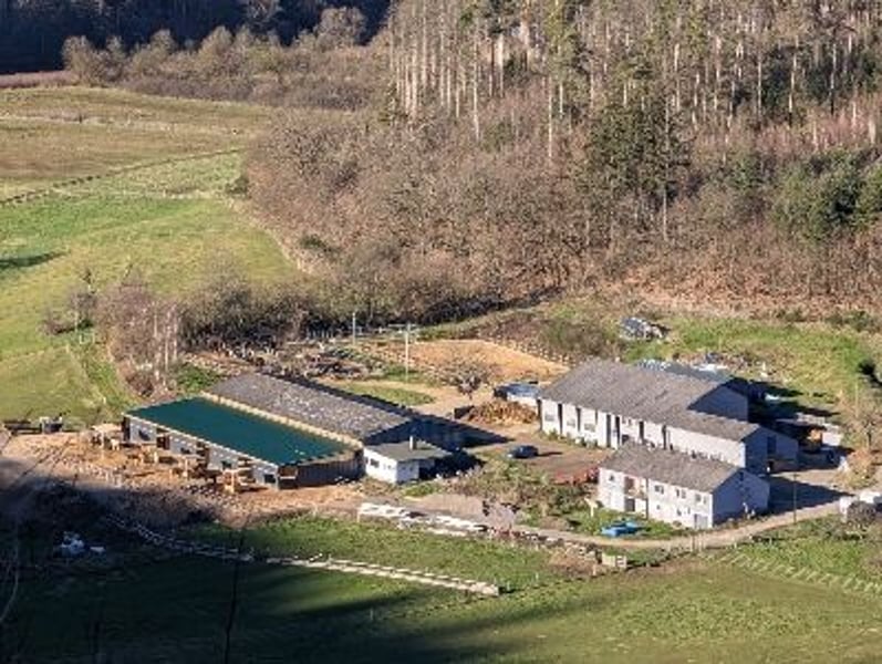 Die Pferde im Offenstall werden über Heuraufen mit Rundballen versorgt.