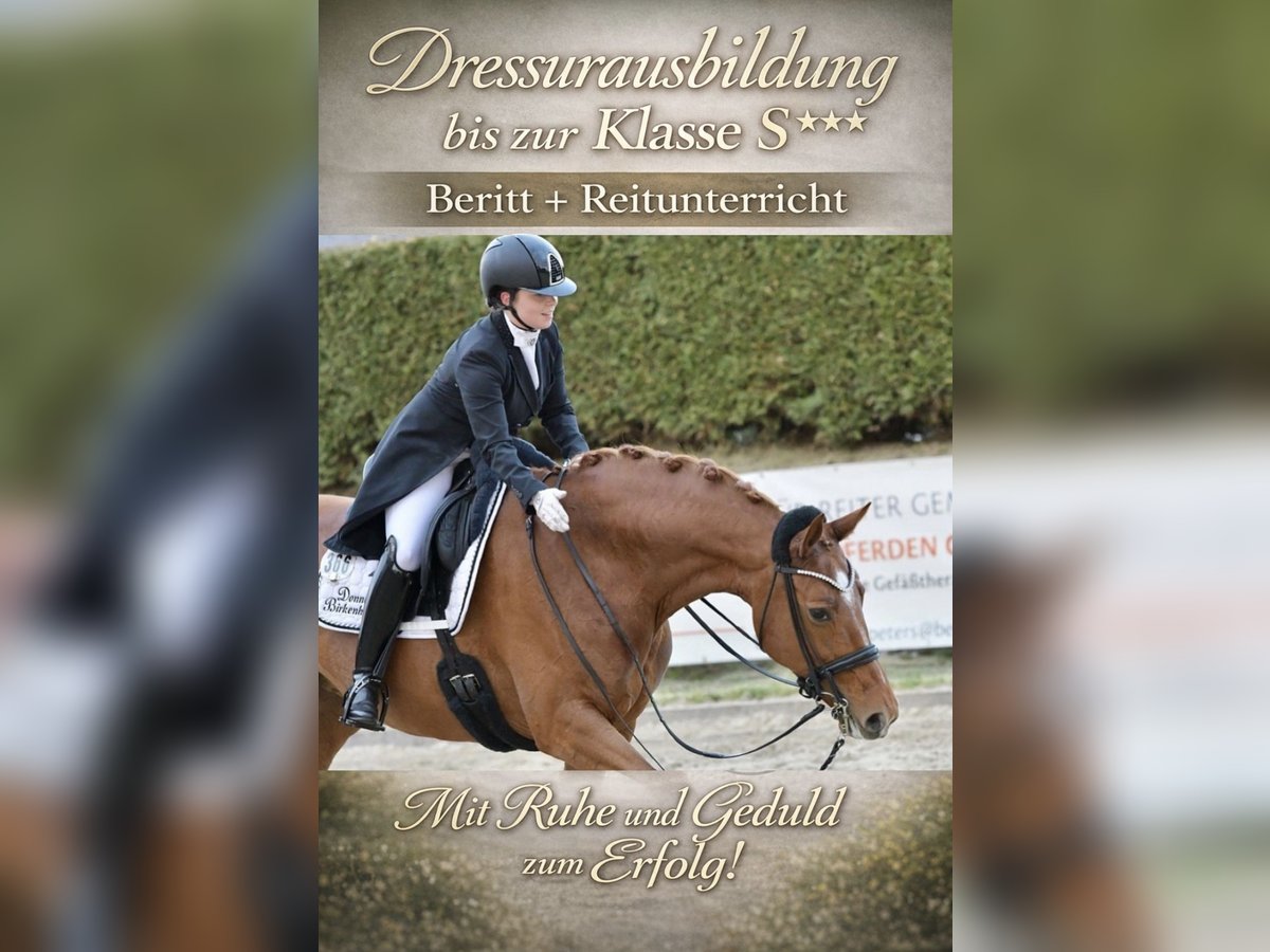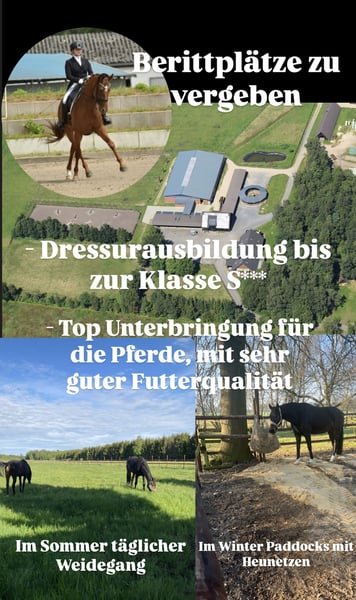 Training places available Due to successful sales, I can accept training horses again. About me: - Qualified equine manager specializing in riding - Multiple victories in dressage up to class S*, as well as several high placements up to S*** - Multiple victories and placements in young horse dressage tests (A-M) - Trainer A competitive sports I offer: - Varied training (pole work, double lunge, free jumping, etc.) - No breaking in! - Horses are trained individually and with the necessary time. The well-being of the horse is very important to us. - Very good feed quality, with plenty of hay! - Daily pasture/paddock/horse walker - There are no rest days! - Competition presentation up to S*** - Horses are additionally treated with magnetic field, laser, or medium-frequency electrotherapy as needed - Support for horse and rider, I am happy to assist you with training in combination with lessons - Pony training - Allergy-friendly boxes (shavings) The horse is considered as a whole package with us. In addition to good riding, good feed management and good cooperation with farriers, physiotherapists, etc. are also included! Love for the horse is our top priority! We look forward to a long-term and successful collaboration! Price: €950 plus VAT (€1130.50) www.birkenhof-sauensiek.de